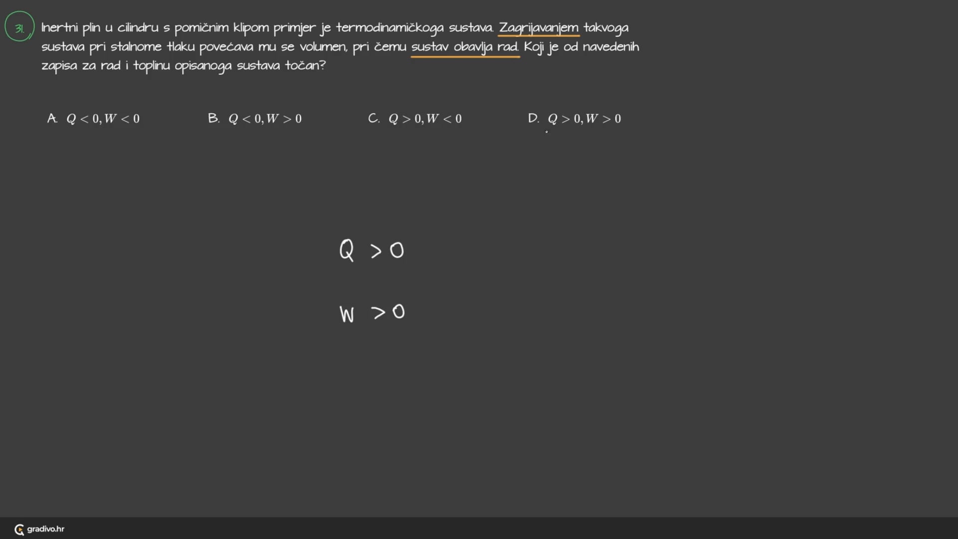 Ukoliko se sustav obavlja rad, tada je W < 0, a ukoliko se rad obavlja nad sustavom, tada je W > 0.