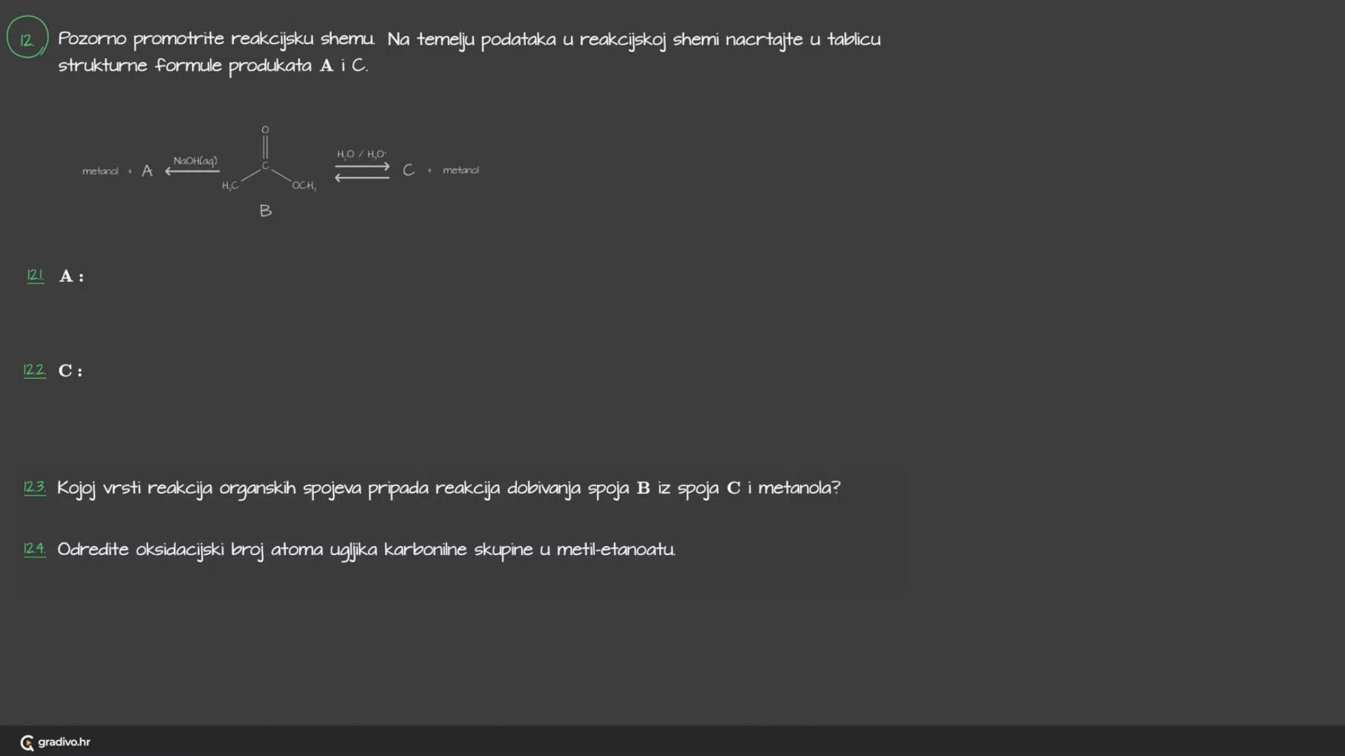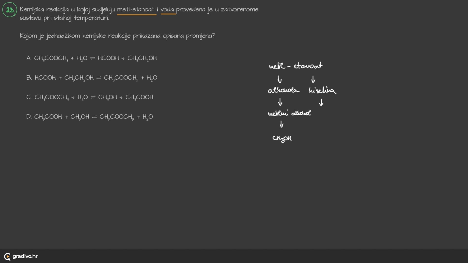 Kiselom hidrolizom estera nastaju karboksilna kiselina i alkohol.