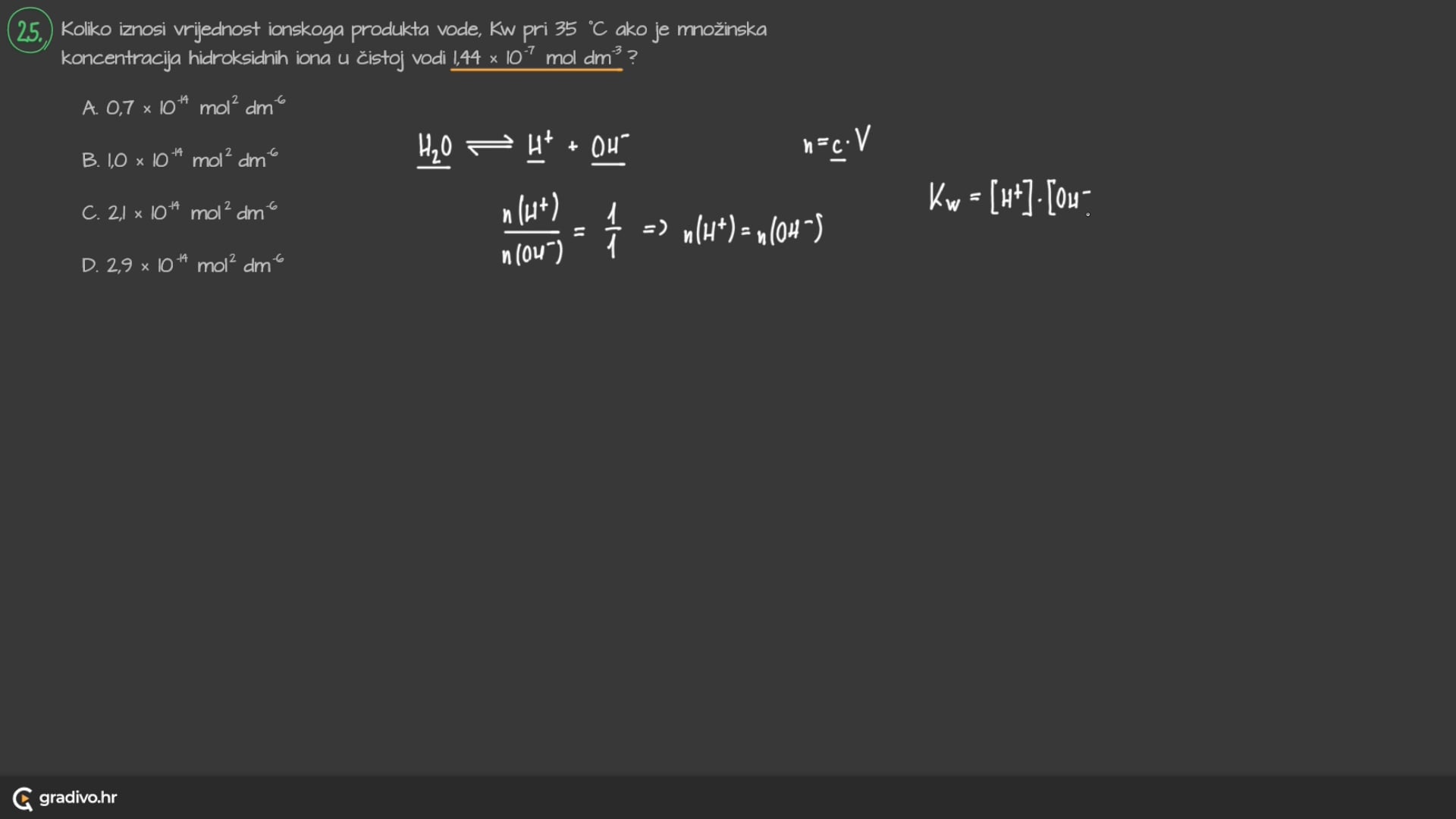 Pomoću tog izraza lako možemo izračunati koliko iznosi ta konstanta pri 25 °C, ako znamo da su ravnotežne koncentracije iona jednake te iznose pri 25 °C