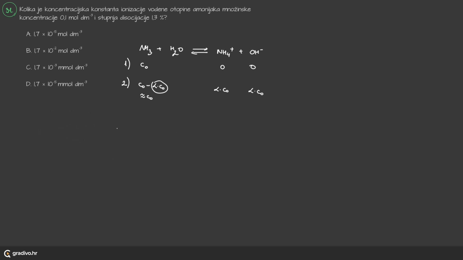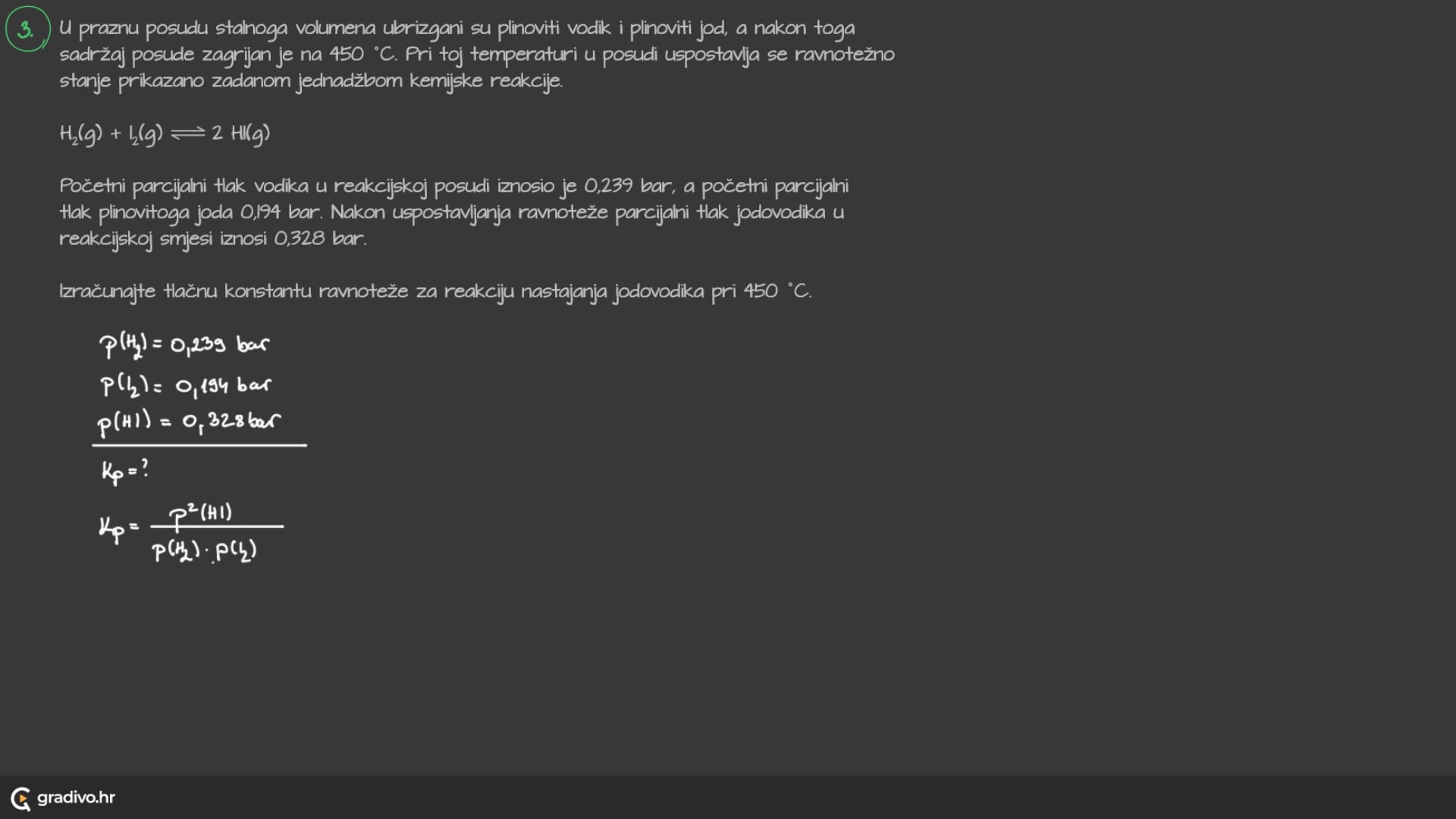 Iz navedenih podataka, moguće je odrediti jednadžbu kemijske reakcije koja će nam koristiti za kreiranje izraza koncentracijske konstante. Navedena formula glasi,