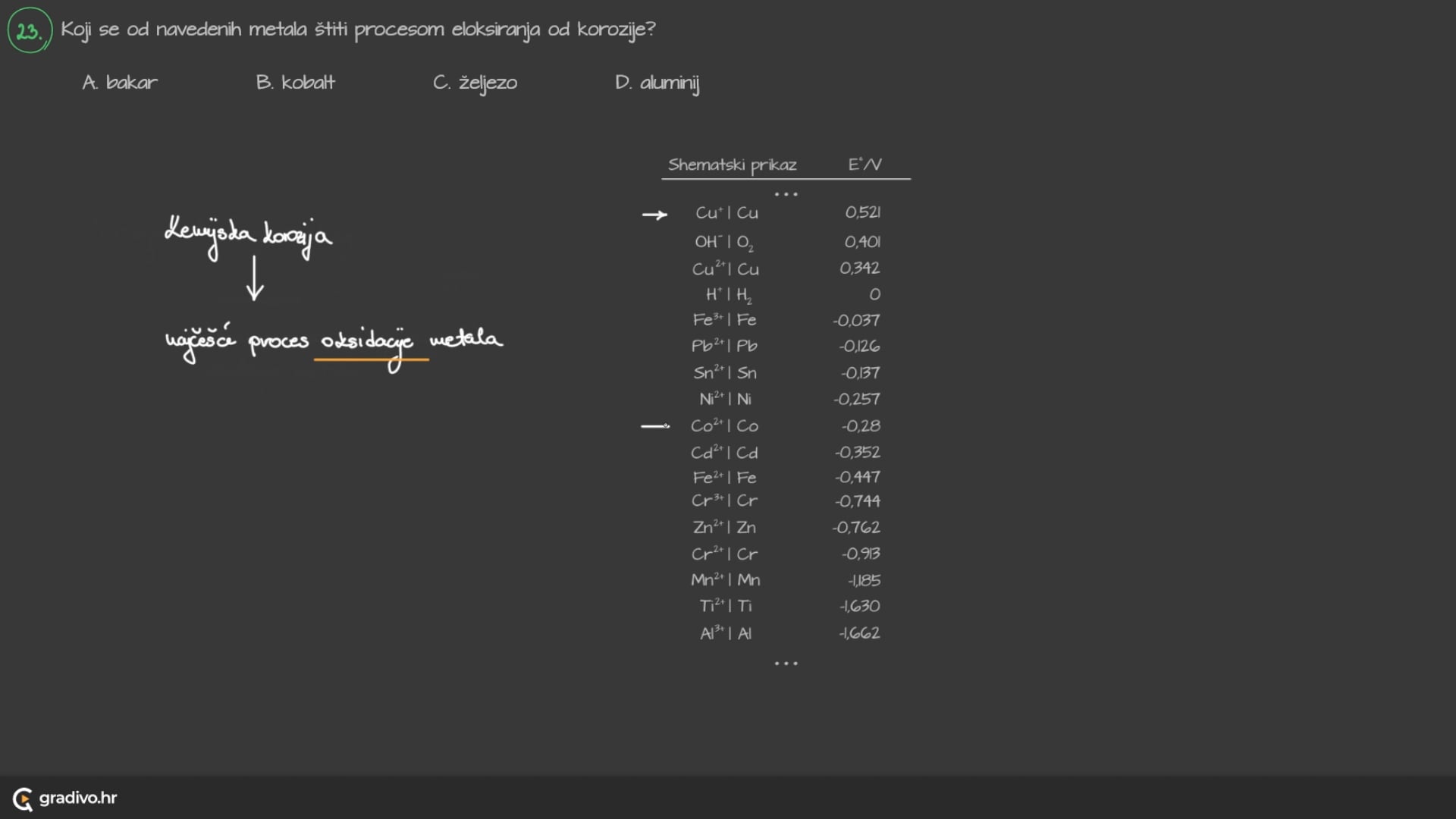 - na elementarnom željezu kreće nastanak hrđe stvaranjem željezovih(II) iona. Cink na pocinčanome željezu se oksidira stvarajući cinkove(II) ione,
