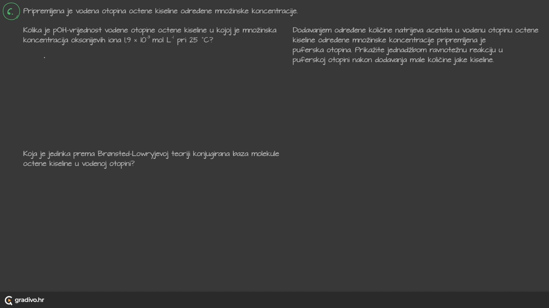 Pa će tako na početku koncentracija Ac- iona biti jednaka početnoj koncentraciji soli cs. Tijekom reakcije, nastajat će još acetatnih iona iz octene kiseline. Nastat će ih onoliko koliko nastaje H+ iona pa će [Ac-] iznositi cs + [H+].