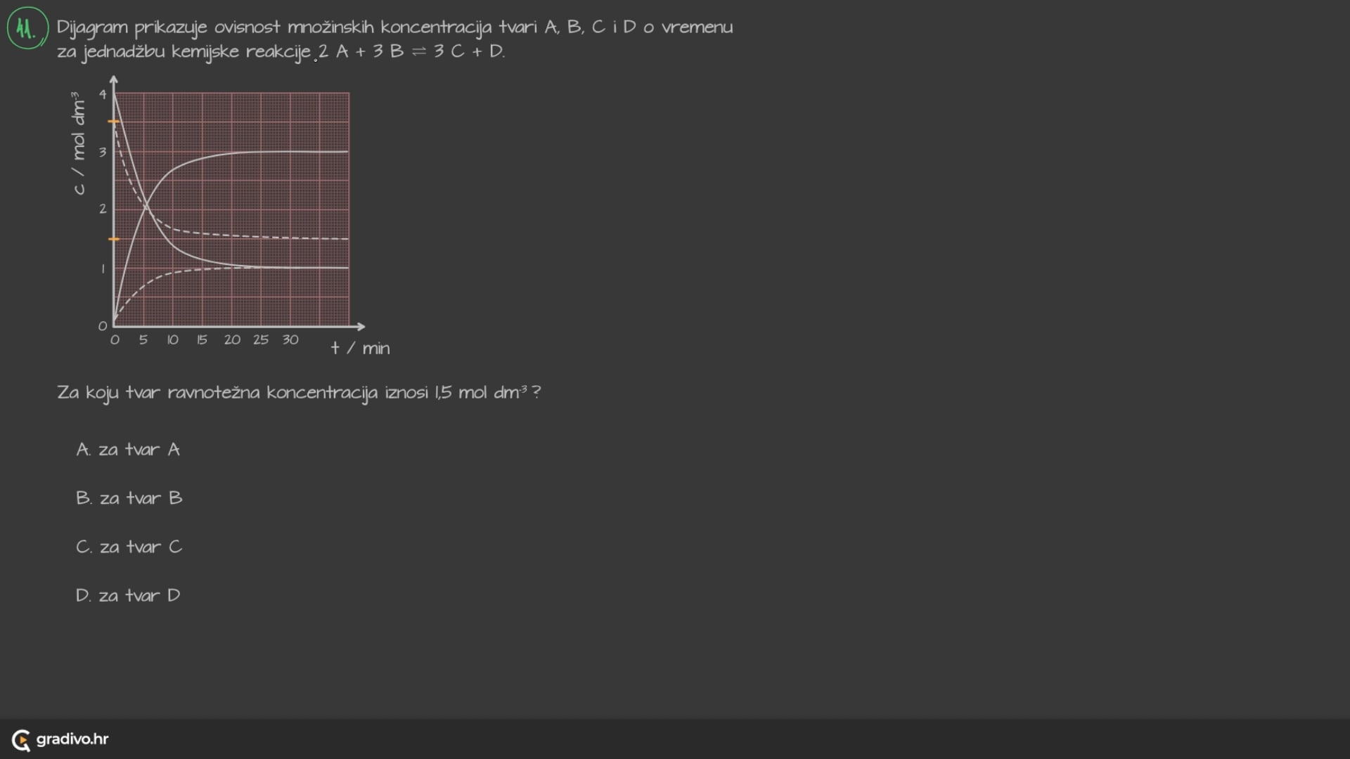 Na samom početku reakcije, koncentracija tekućeg broma je maksimalna, dok je koncentracija plinovitog broma 0 mol dm-3, zato što u tom samom početnu još uvijek nije krenula reakcija. Nakon određenog vremena primijećujemo da dolazi do stabilizacije koncetracija, odnosno koncentracije reaktanta i produkta se ne mijenjaju u vremenu. To područje grafa pokazuje nam kada je nastupilo