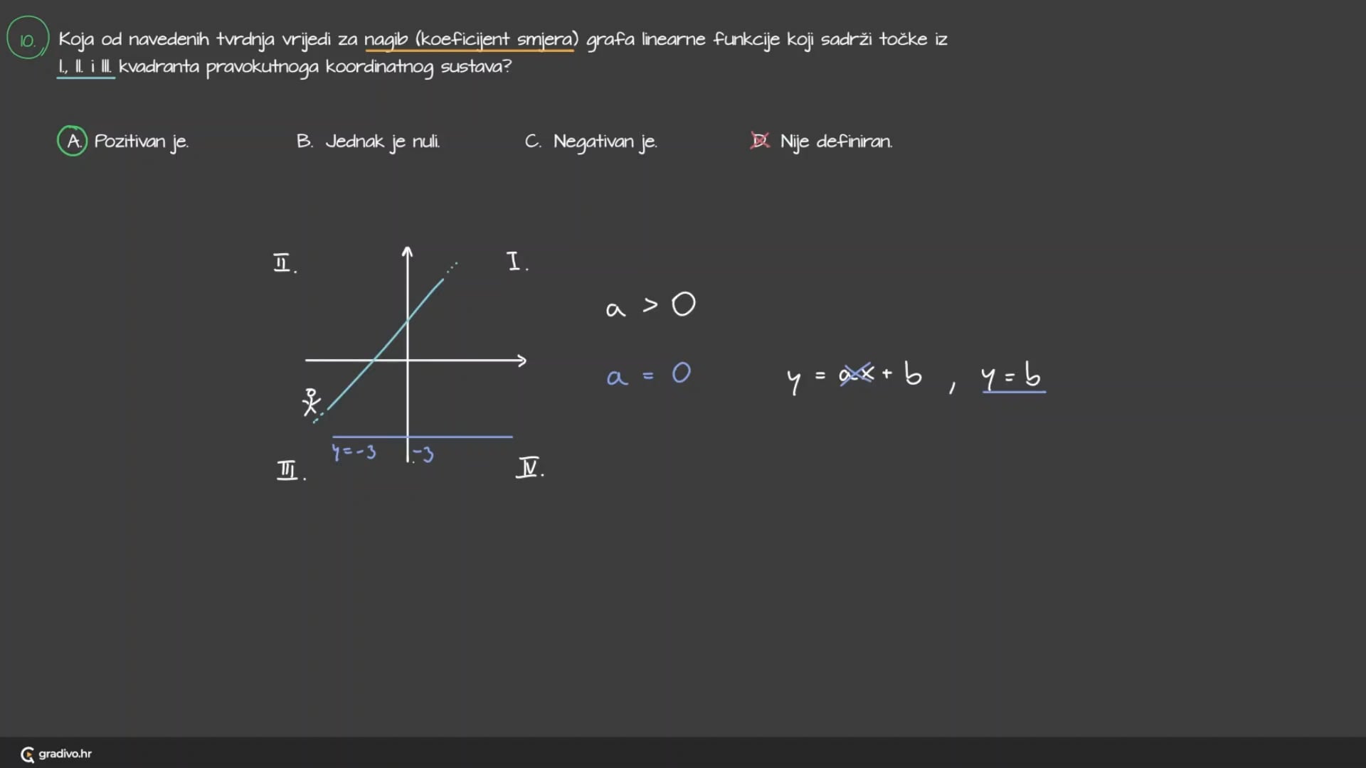 Graf svake linearne funkcije je pravac. Za pravac ćemo reći da raste, ako gledajući s lijeva na desno, idemo sve više i više. U tom slučaju je $a>0$. Obrnuto, ako s lijeva na desno pravac izgleda kao da se spušta, reći ćemo da pada i tada je $a<0$.
