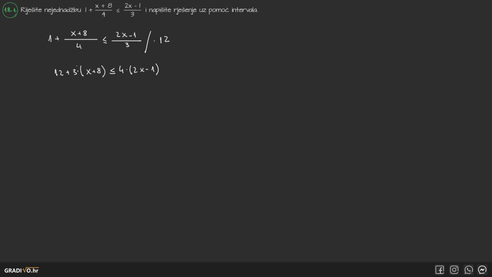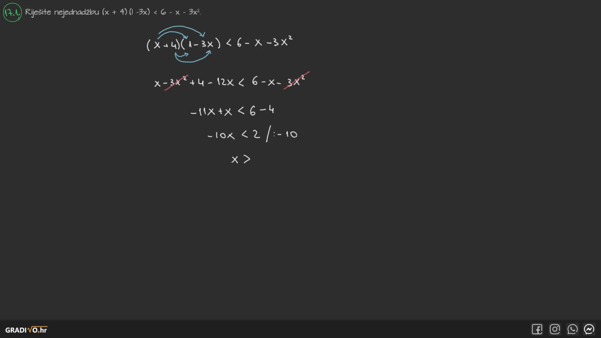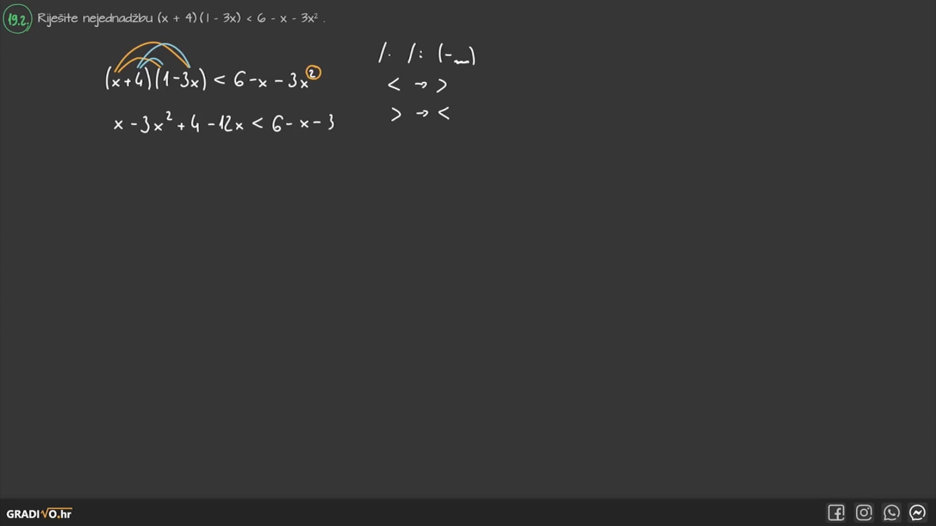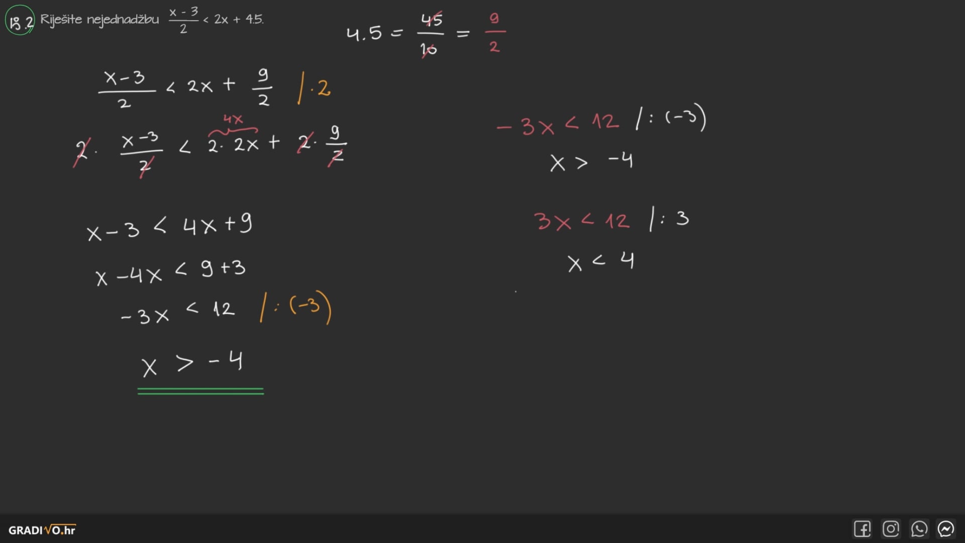 Postupak rješavanja linearnih nejednadžbi isti je kao i kod linearnih jednadžbi, sve do trenutka kada množimo ili dijelimo jednadžbu negativnim brojem. Tada ćemo, osim što ćemo lijevu i desnu stranu pomnožiti/podijeliti tim brojem, okrenuti znak nejednakosti u drugu stranu. Sve ostalo je u potpunosti isto.