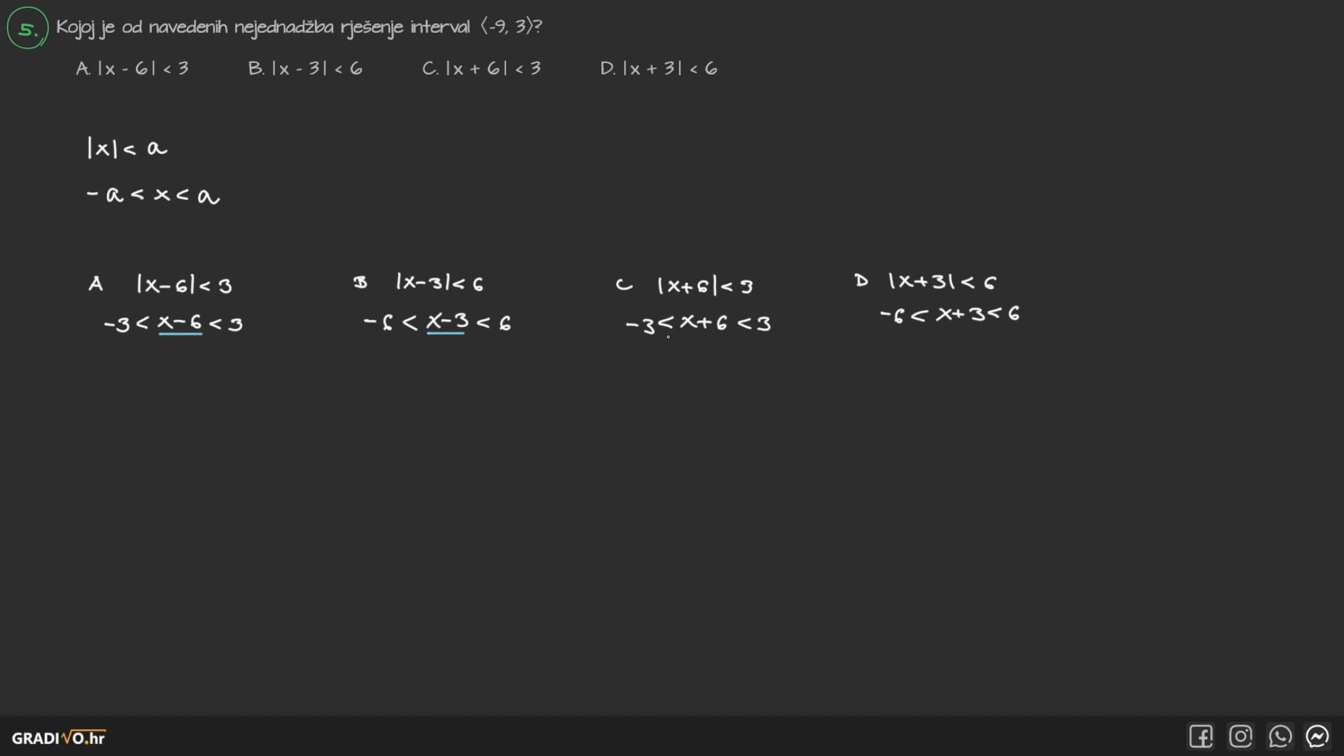 - Ako je $a>0$, rješenje nejednadžbe $|x| \leq a$ zapisujemo na jedan od tri načina (odnosno rješavamo se apsolutne vrijednosti):