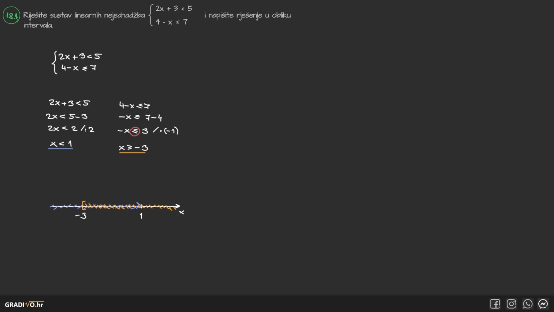 2. na istom brojevnom pravcu označimo rješenja svake nejednadžbe različitim bojama ili crticama okrenutima u drugu stranu