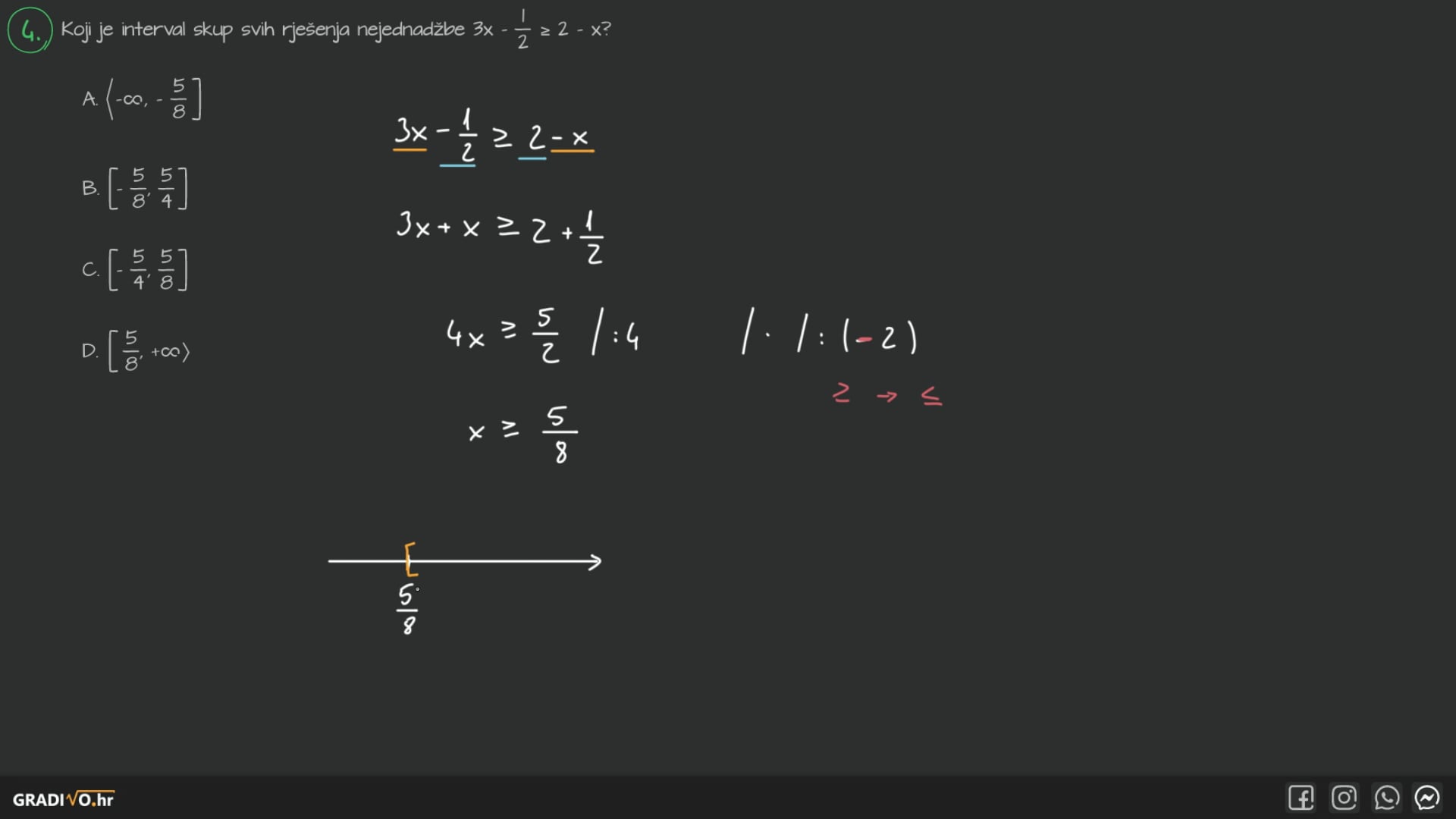 3. naše konačno rješenje će biti presjek ova dva rješenja, odnosno onaj dio brojevnog pravca gdje se nalaze obje boje ili gdje se crtice sijeku