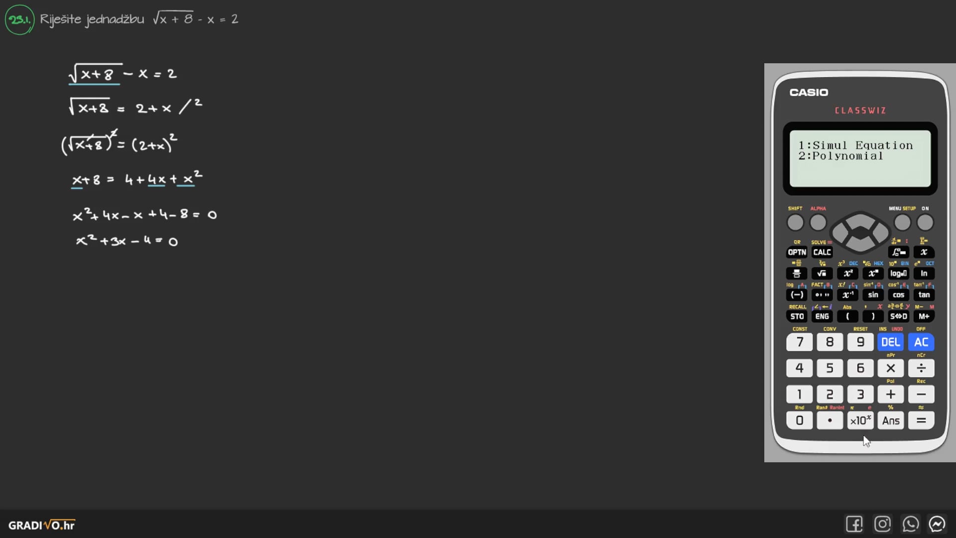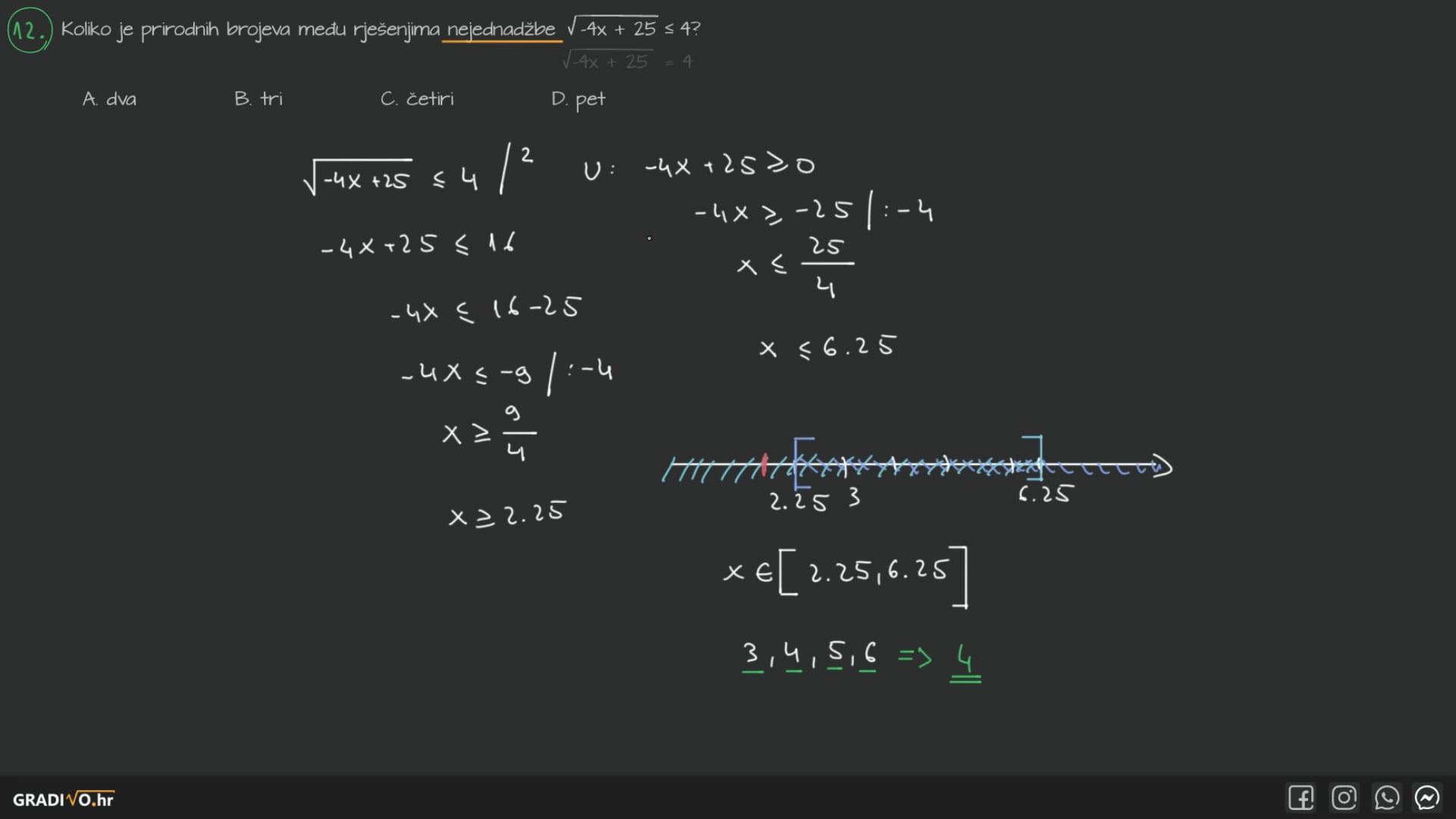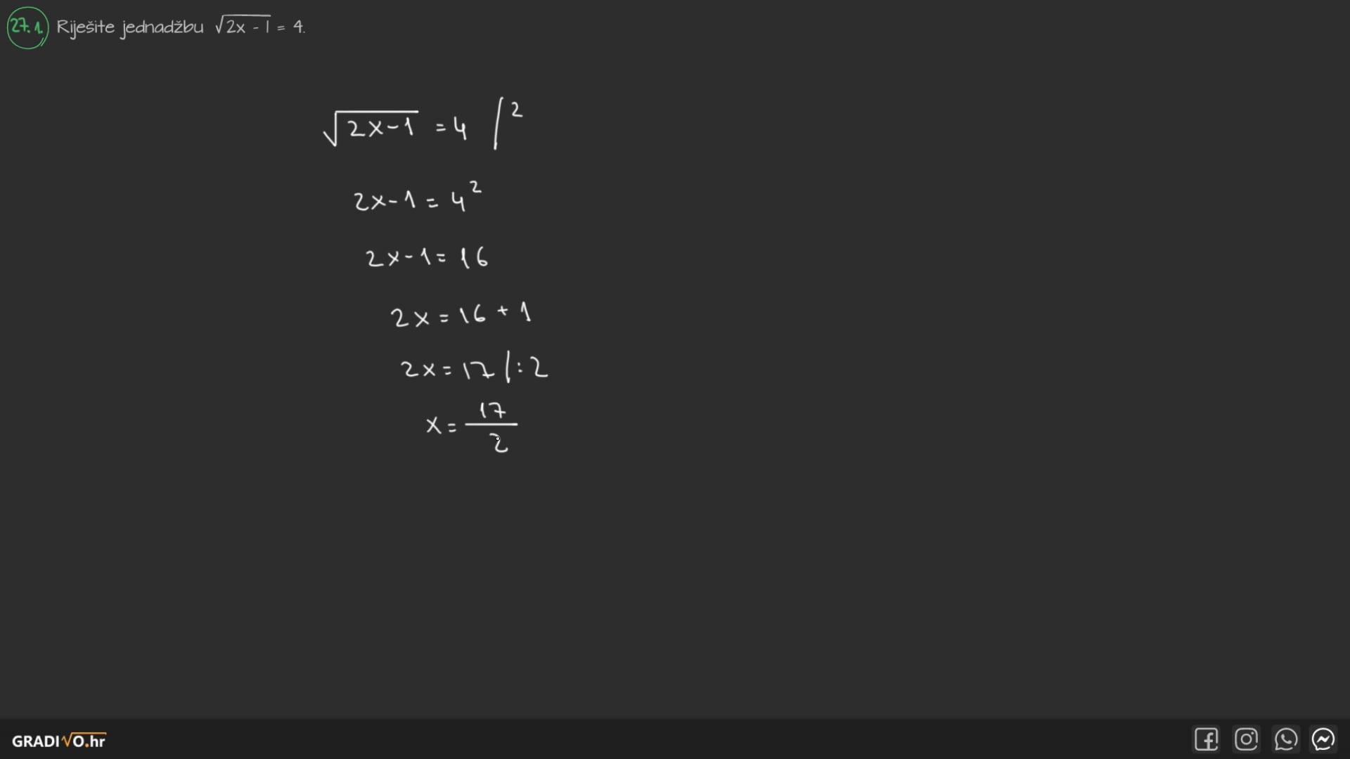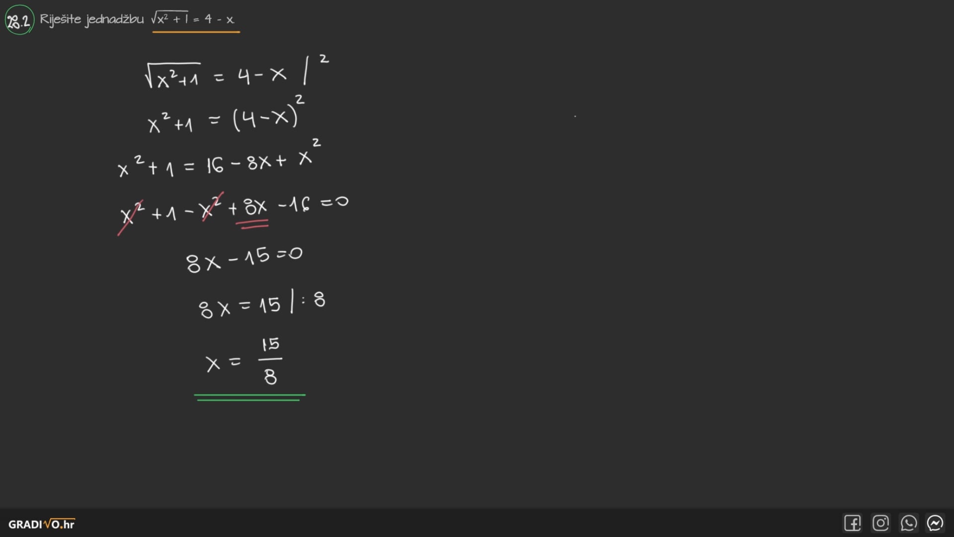 4. Provjerimo rješenja! Imamo dvije mogućnosti: ili svako rješenje vratimo u početnu jednadžbu i izbacimo ona koja ju ne zadovoljavaju ili raspišemo uvjete za korijen (bilo što što se nalazi pod korijenom mora biti veće ili jednako od nule).