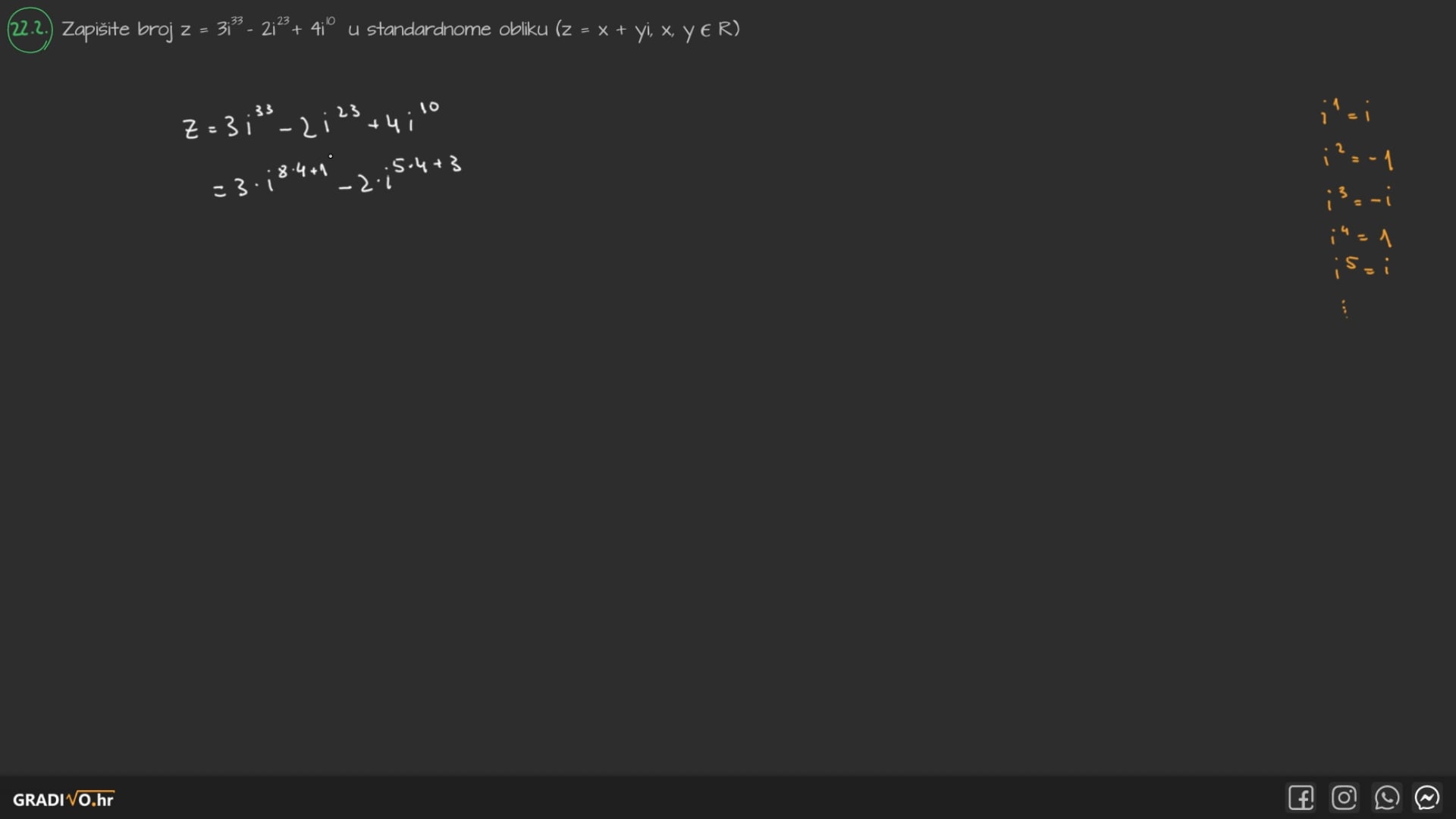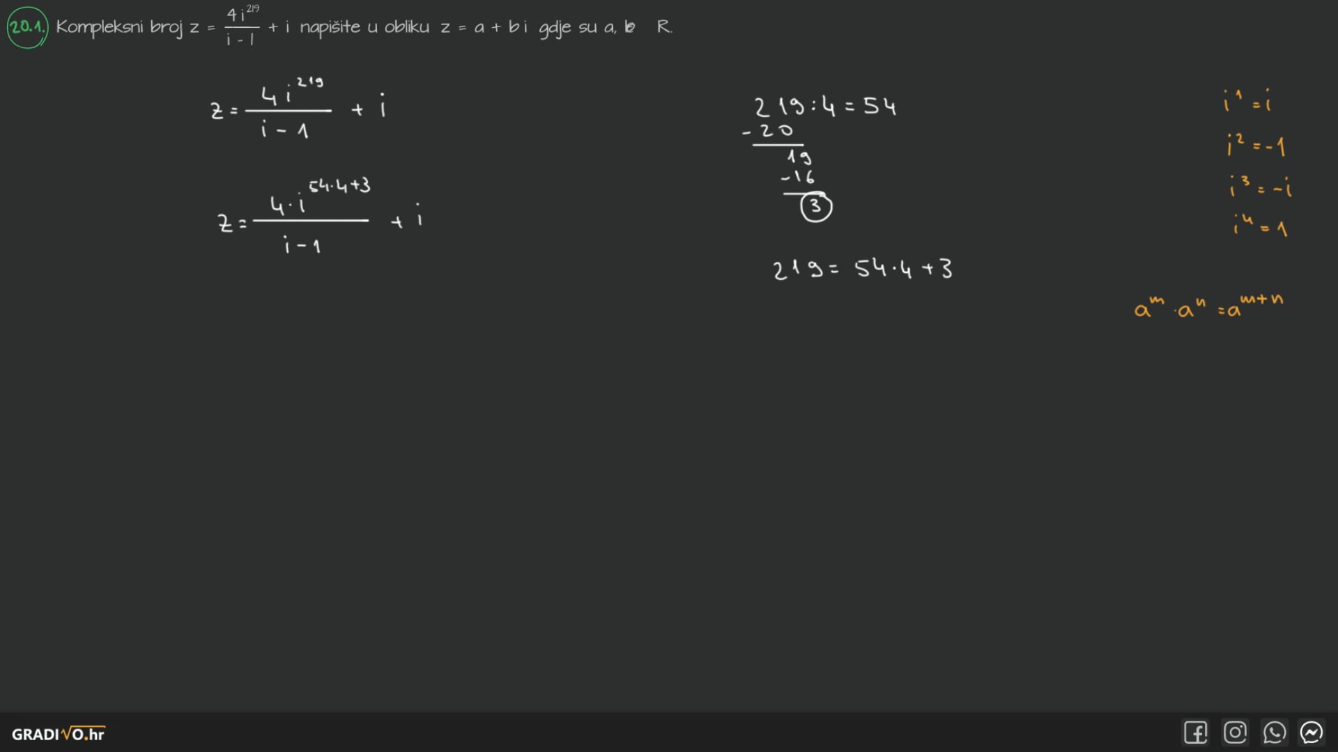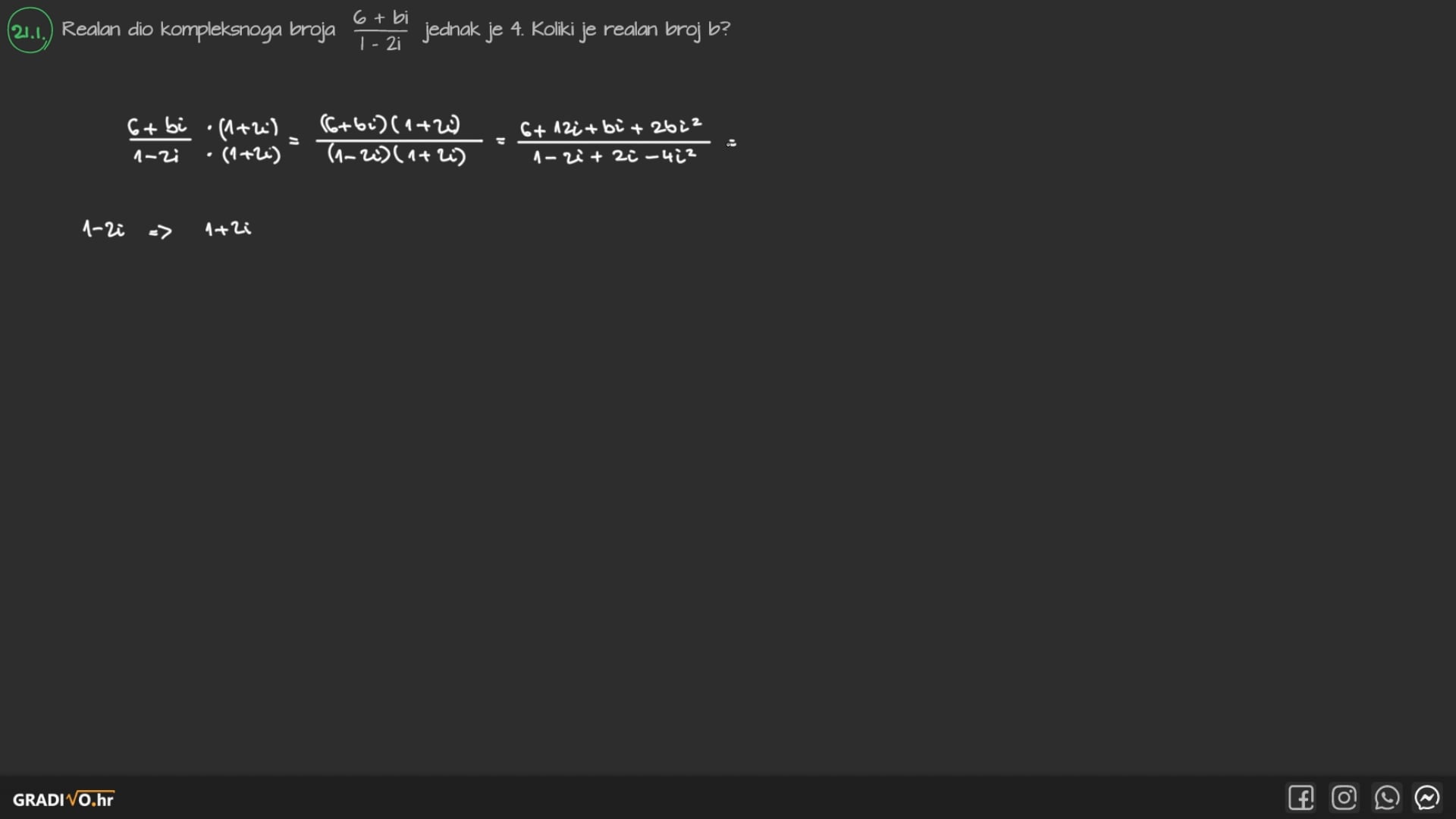 1. Da bi podijelili dva kompleksna broja, prvo se moramo riješiti imaginarne jedinice iz nazivnika. To radimo tako da zadani razlomak pomnožimo razlomkom koji i u brojniku i u nazivniku ima konjugirano kompleksni broj kompleksnog broja koji je kod nas u nazivniku.
