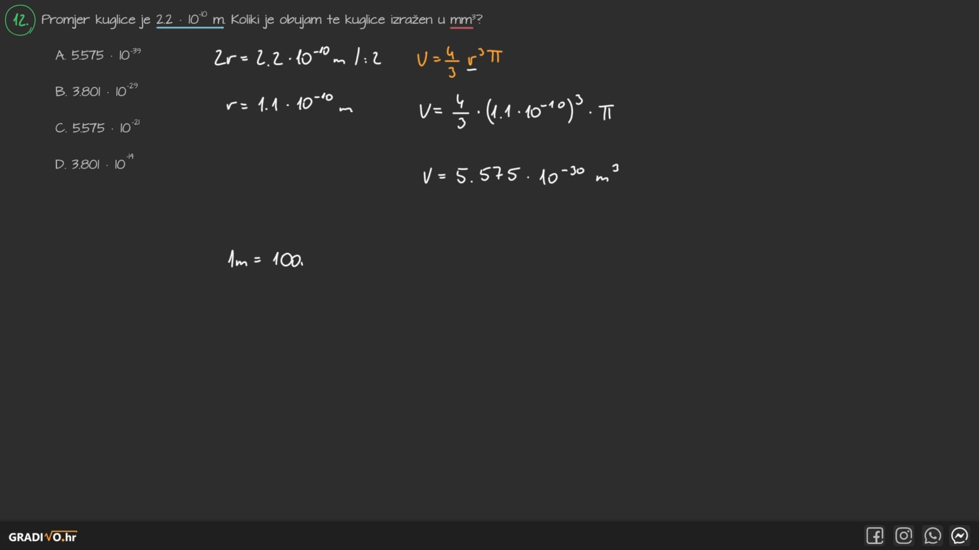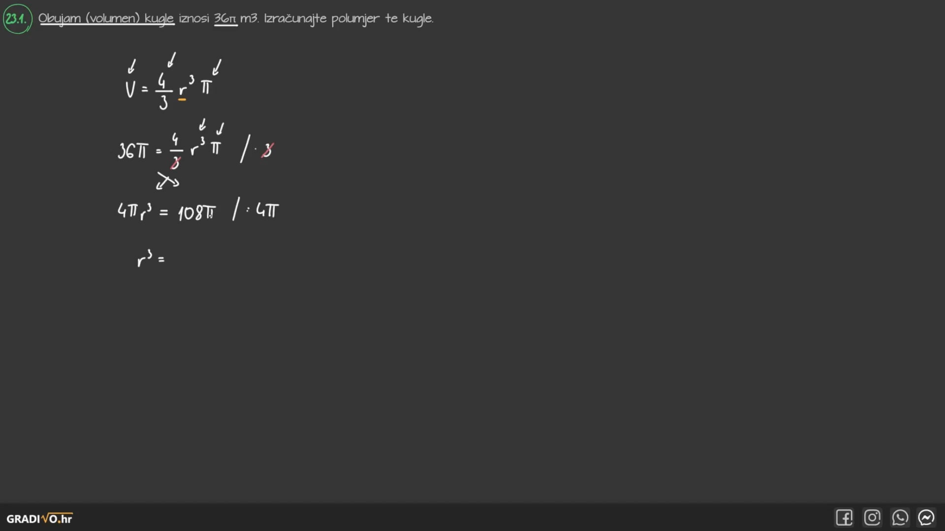 Obujam (volumen) kugle je veličina kojom mjerimo koliki dio prostora obuhvaća kugla. Računa se kao četiri trećine kubiranog radijusa kugle $R$ puta $\pi$.