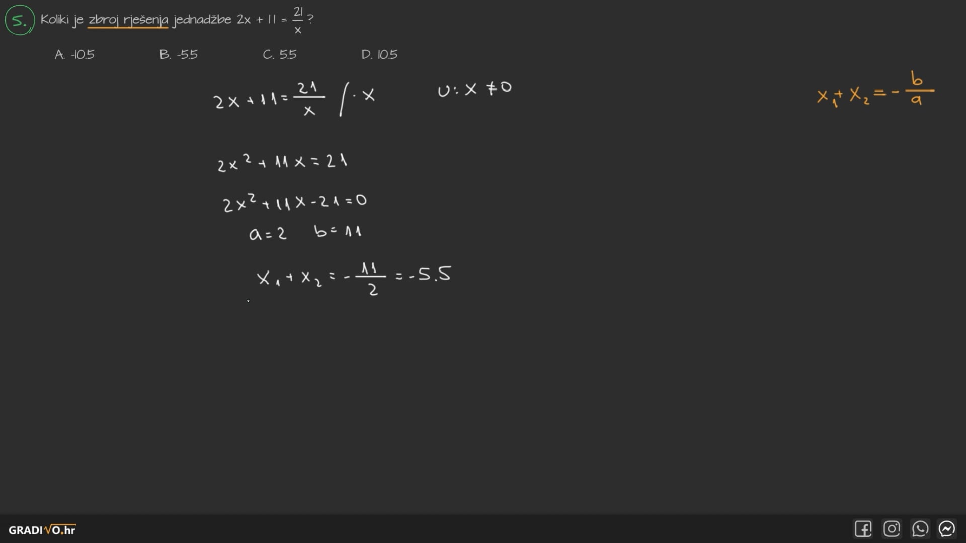 Ako sa $x_1$ i $x_2$ označimo rješenja kvadratne jednadžbe, a $a$, $b$ i $c$ su koeficijenti kvadratne jednadžbe kao prije, onda vrijedi: