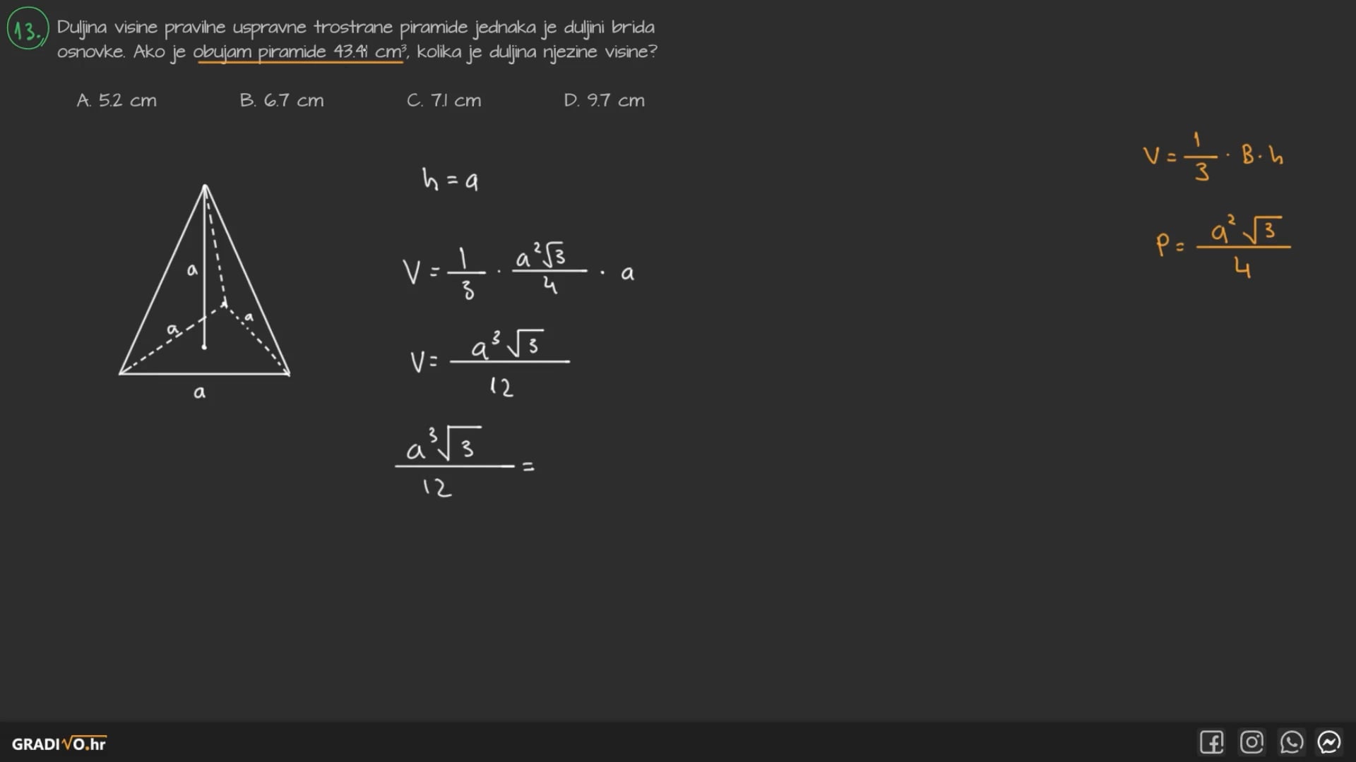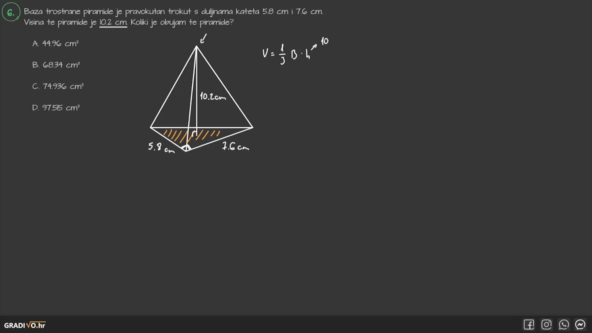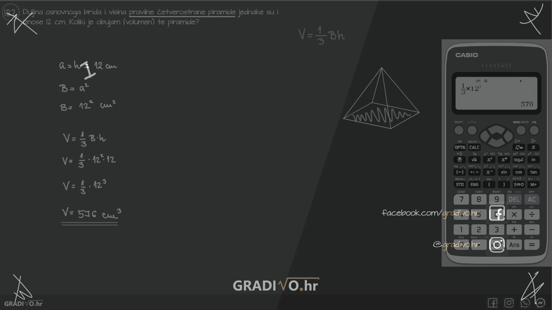 Obujam (volumen) piramide je veličina kojom mjerimo koliki dio prostora obuhvaća piramida. Računa se kao umnožak površine baze $B$ i visine piramide $h$ podijeljen s $3$.