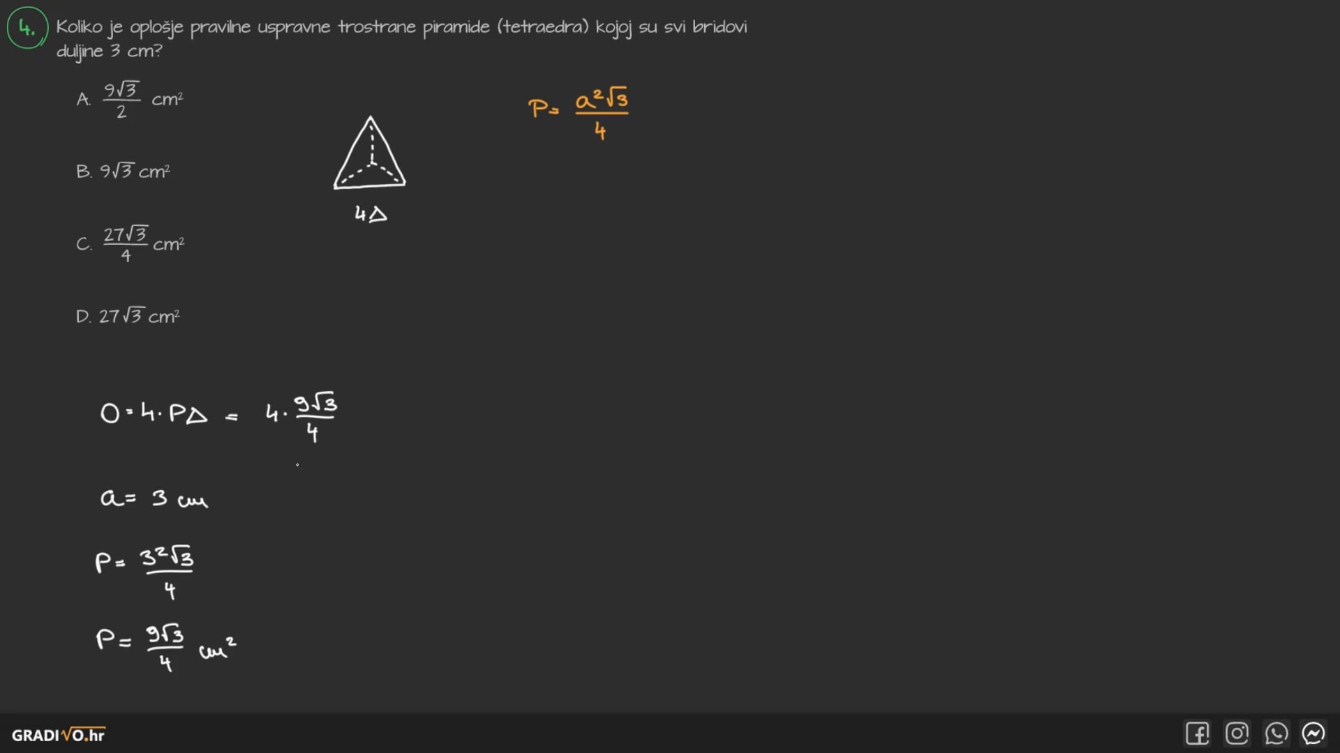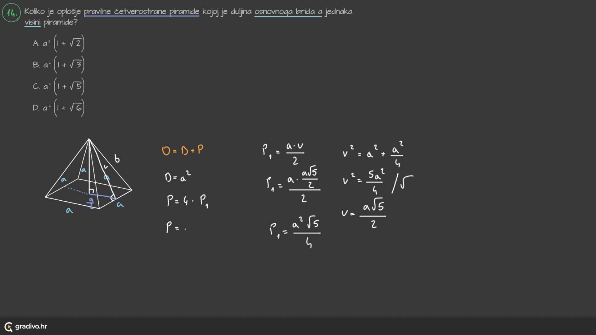 Oplošje je površina svih likova koji ograđuju piramidu. Računa se kao zbroj površina svih strana piramide, dakle zbroj površine baze $B$ i površine pobočja $P$.