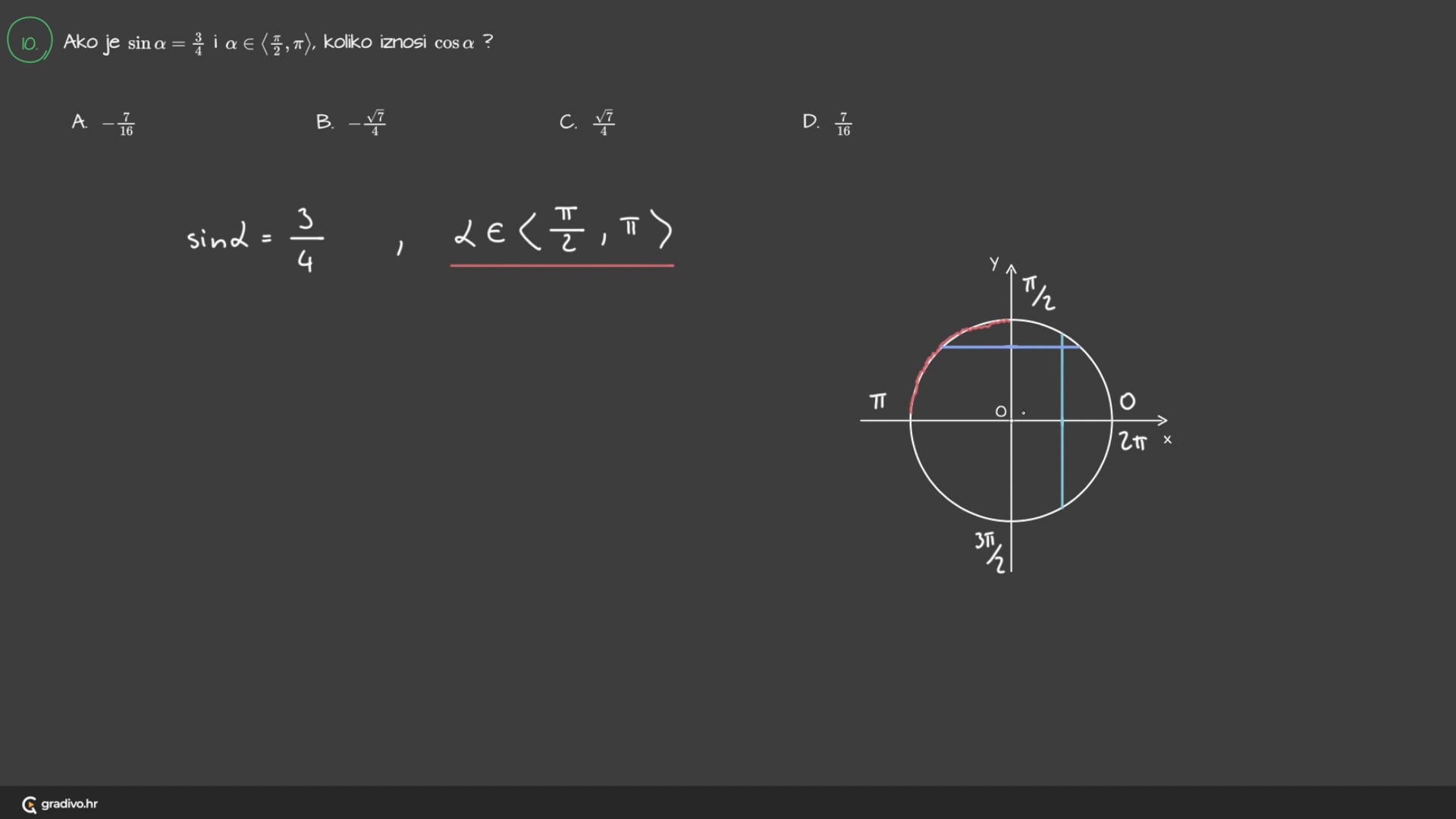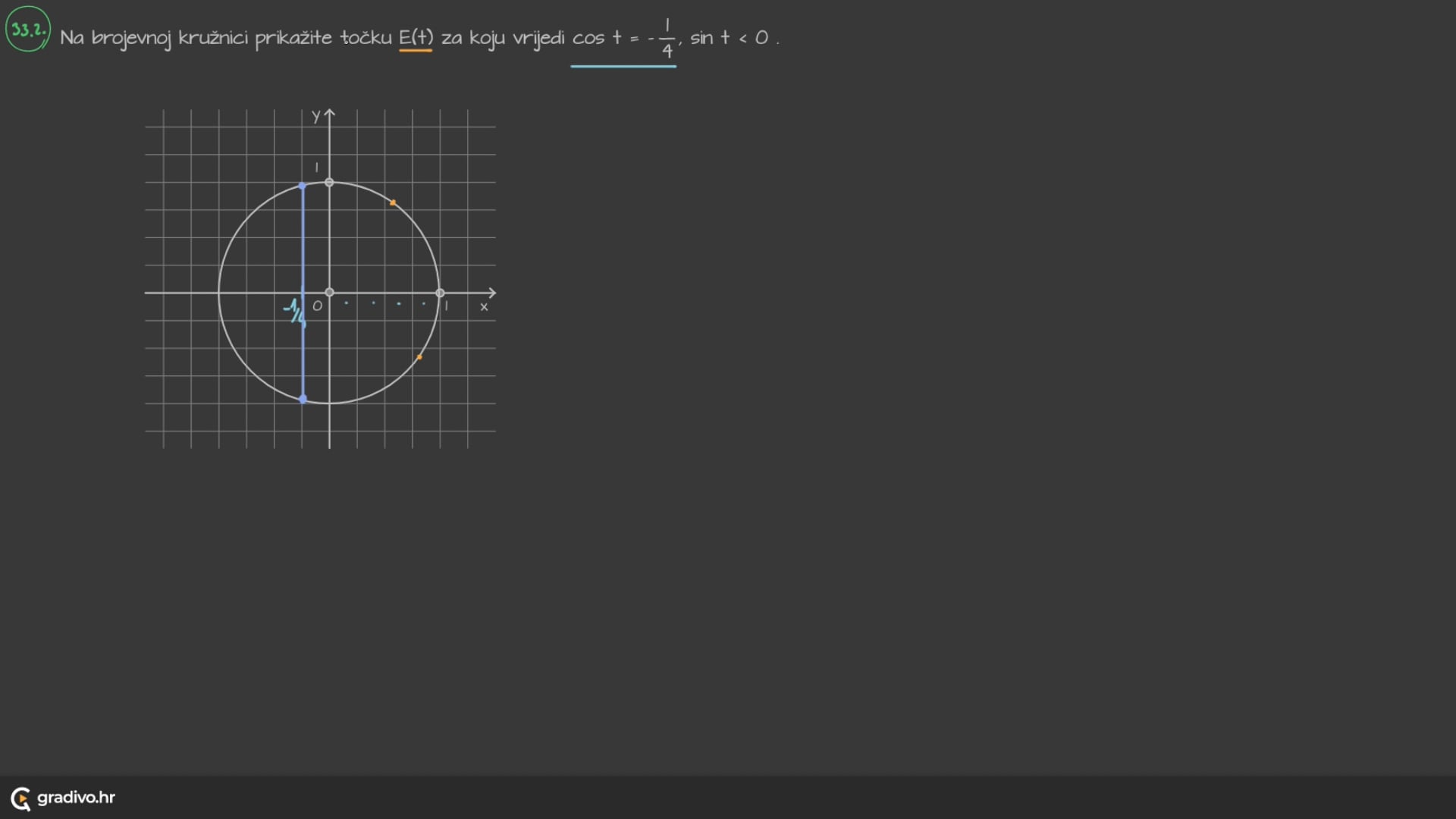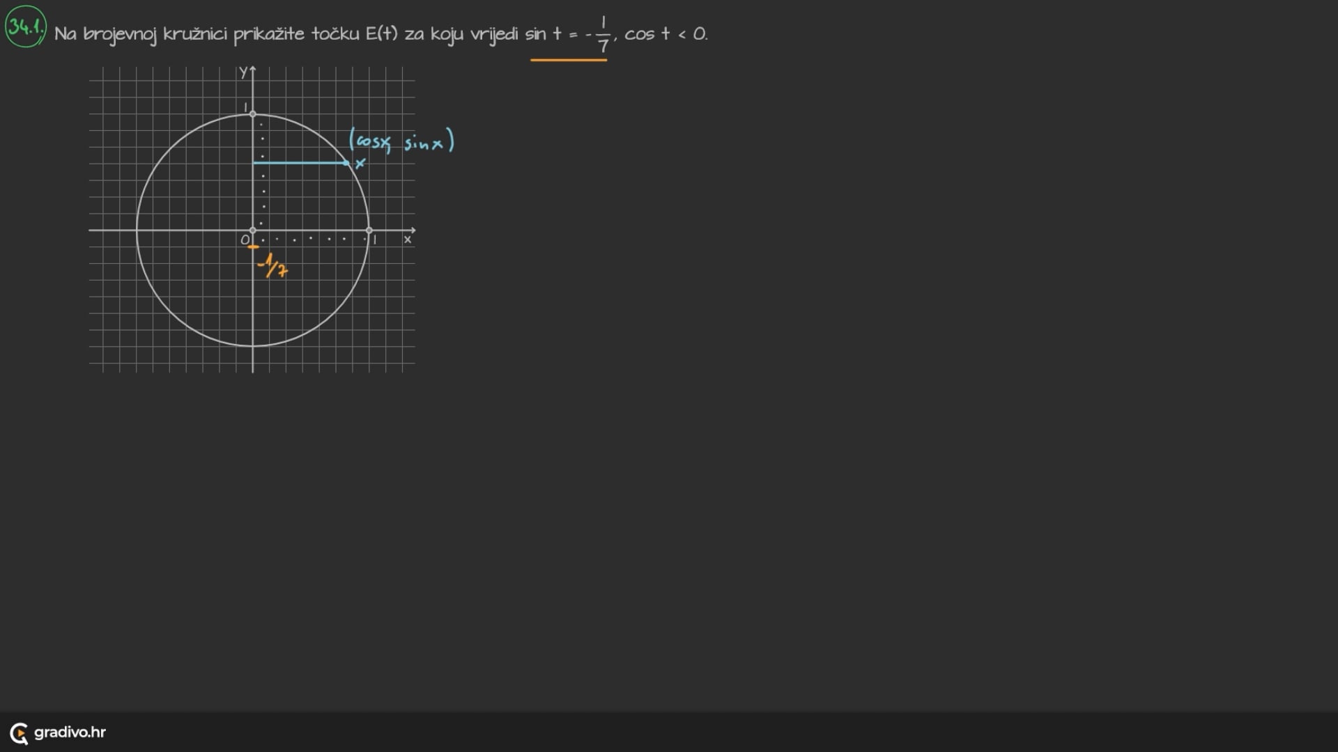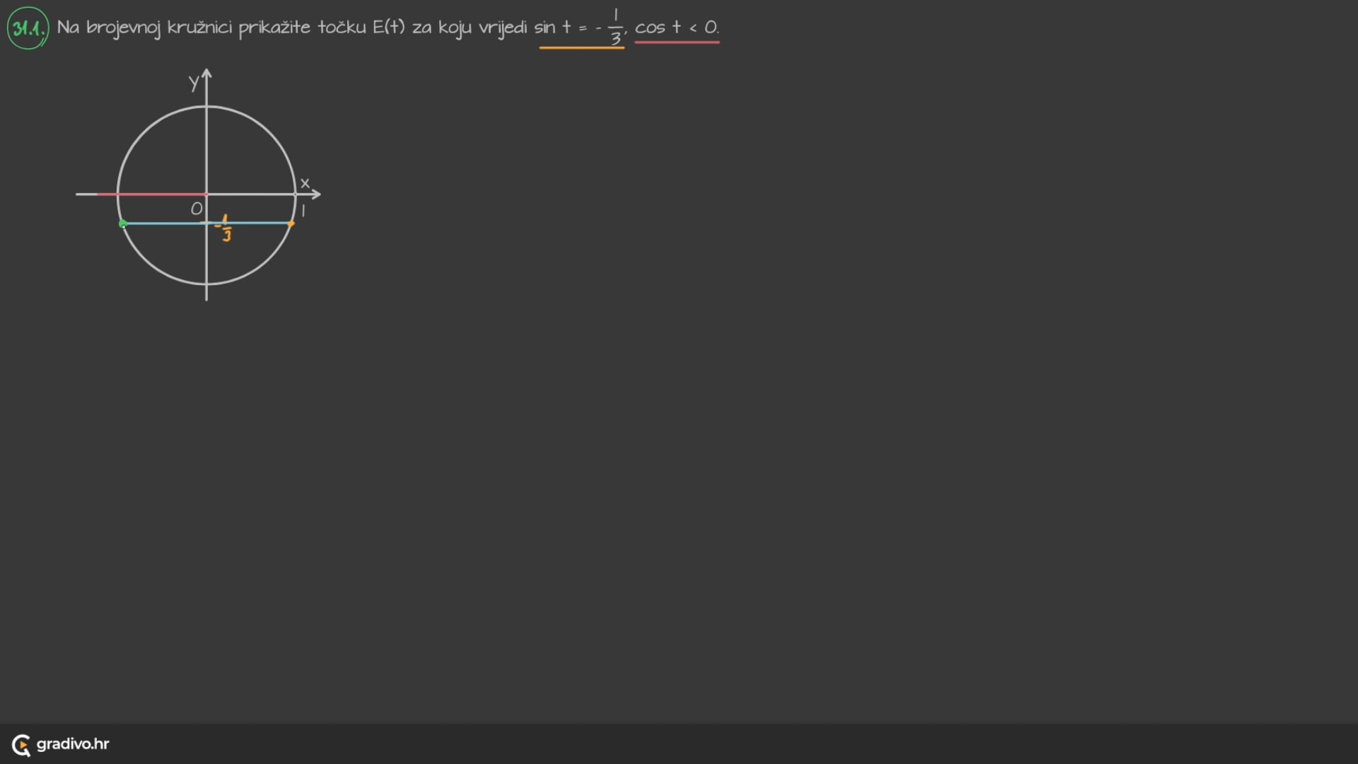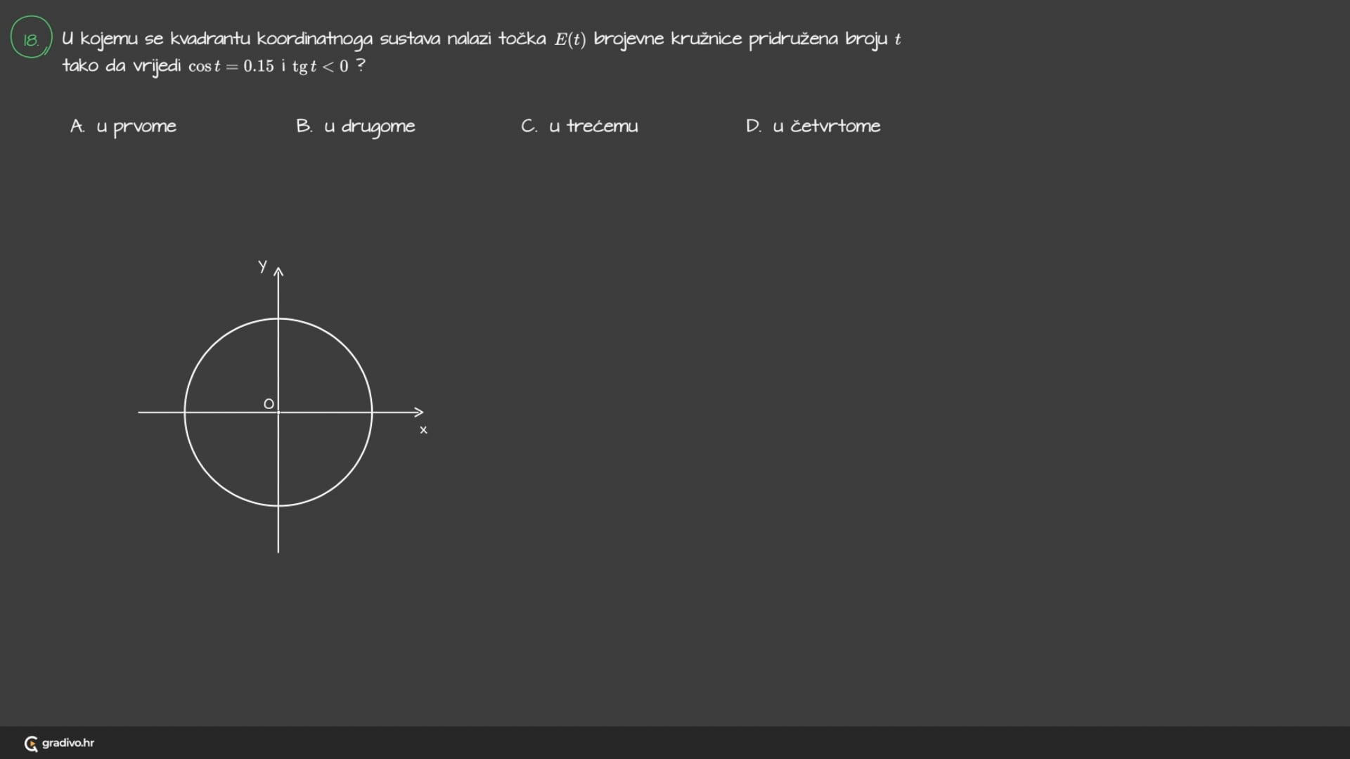 Točke brojevne kružnice koje ćemo najčešće koristiti dane su na slici i dobro ih je naučiti napamet. Npr. broju $0$ na brojevnom pravcu, na kružnici odgovara točka $(1,0)$, dok broju $\frac{\pi}{2}$ odgovara $(0,1)$, itd.