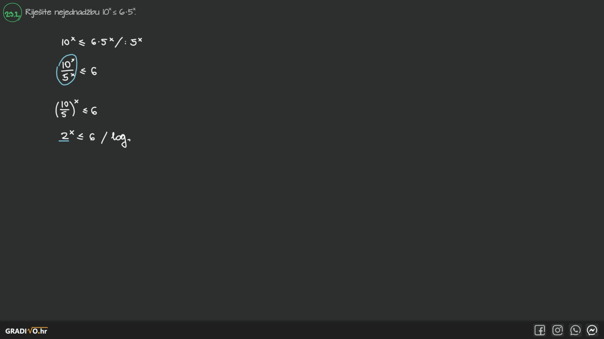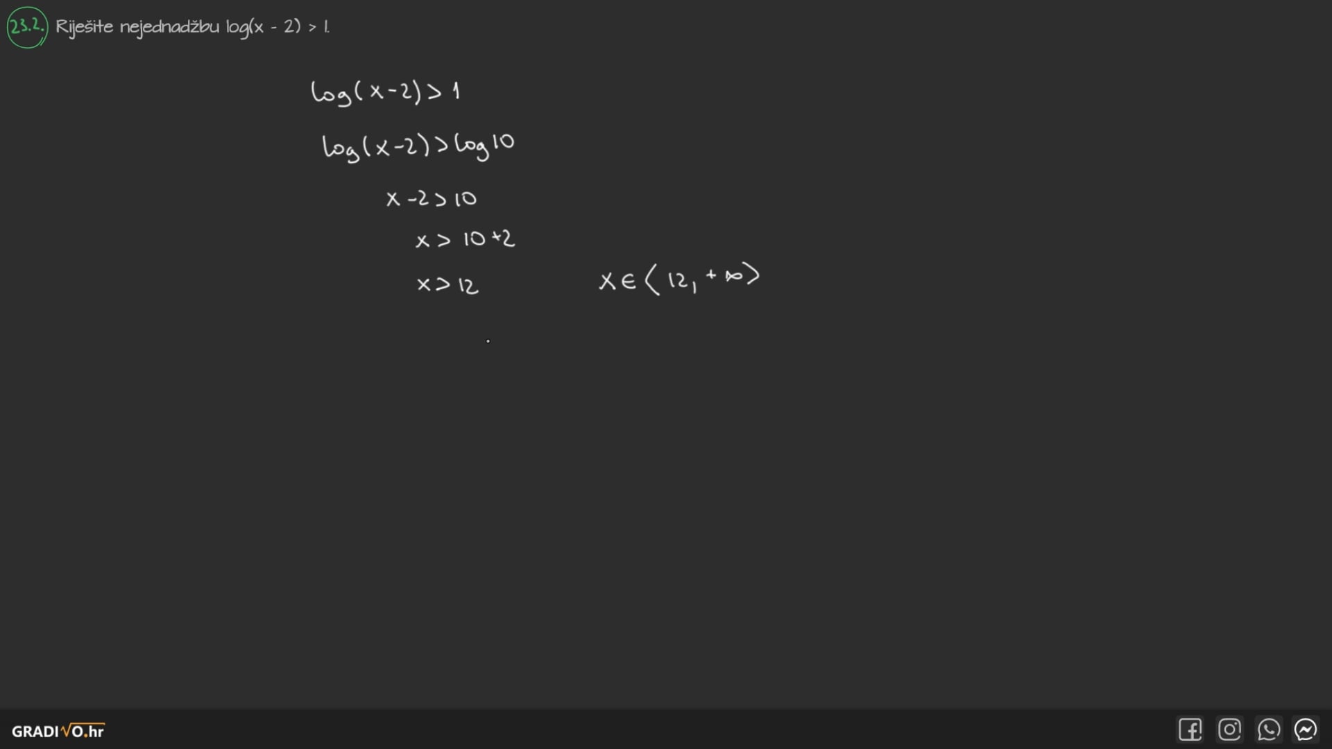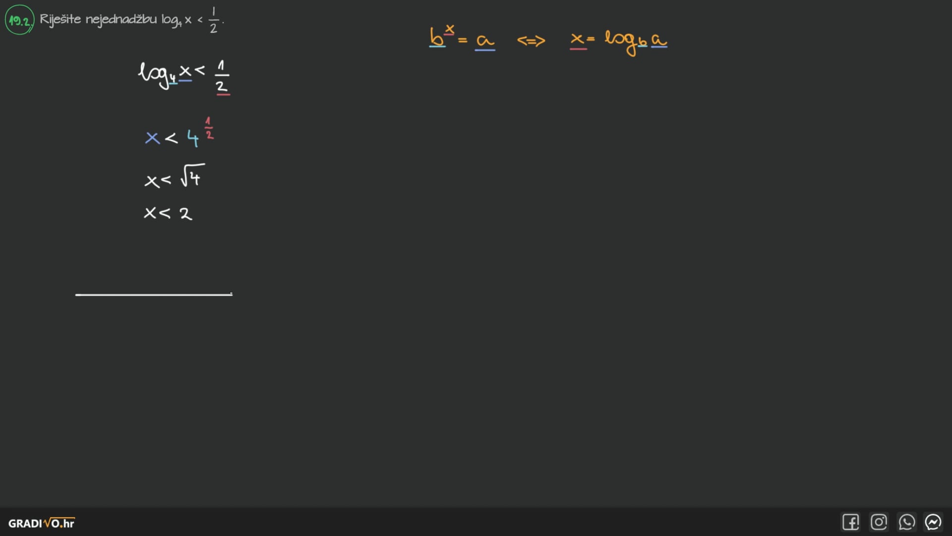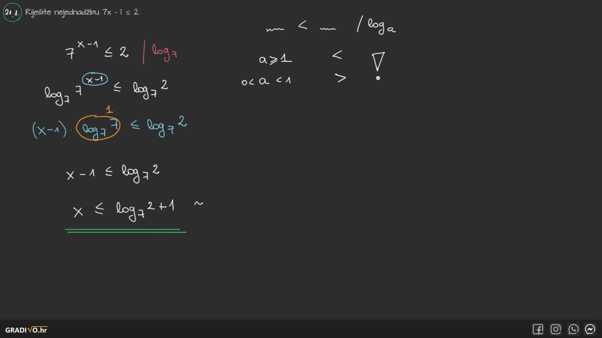 Ako je nepoznanica u bazi, samo se pažljivo riješimo logaritma koristeći "lijevi, desni, srednji" i znak nejednakosti ostavimo kakav je i bio. Pri tome, naravno, pazimo na uvjet za bazu logaritma!
