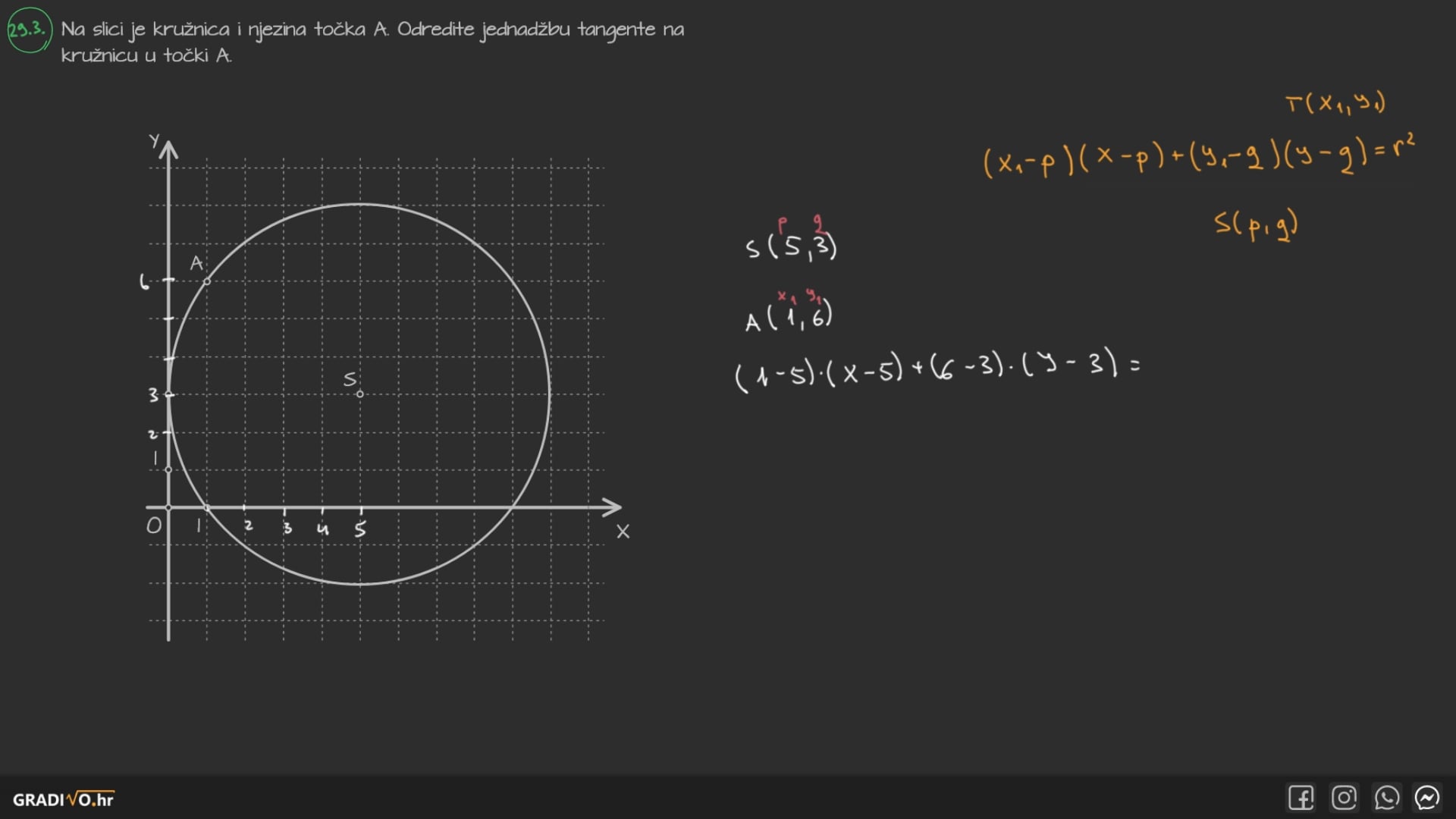 Tangenta na kružnicu u točki $T(x_0,y_0)$$ \left(x_{0}-p\right)(x-p)+\left(y_{0}-q\right)(y-q)=r^{2} $
