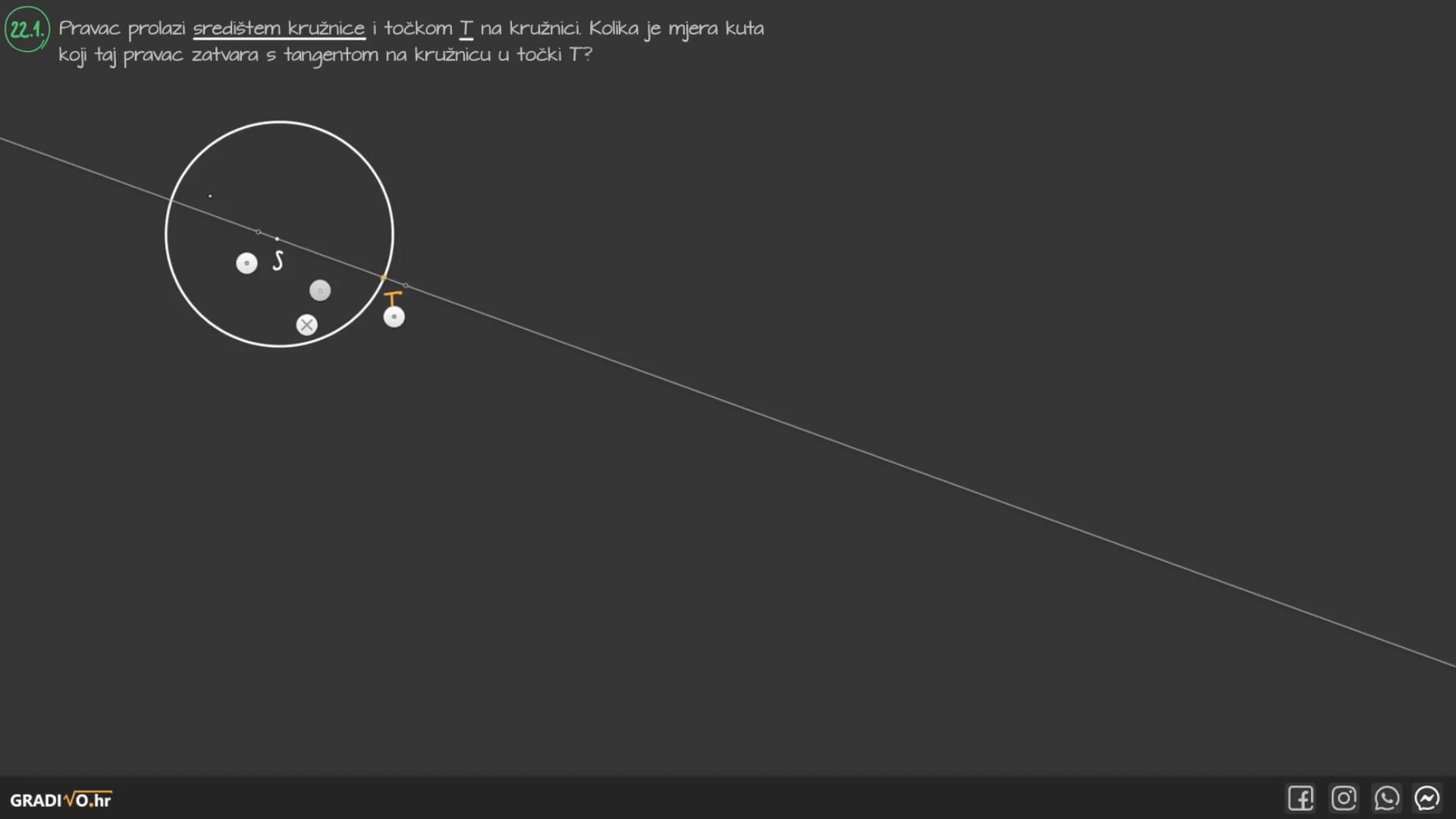 Napomena! Ako se traži tangenta na kružnicu iz točke $T(x_0,y_0)$ koja nije na kružnici, potrebno je riješiti sustav od dvije jednadžbe: jednadžba pravca koji prolazi točkom $T(x_0,y_0)$ i jednadžba kružnice.