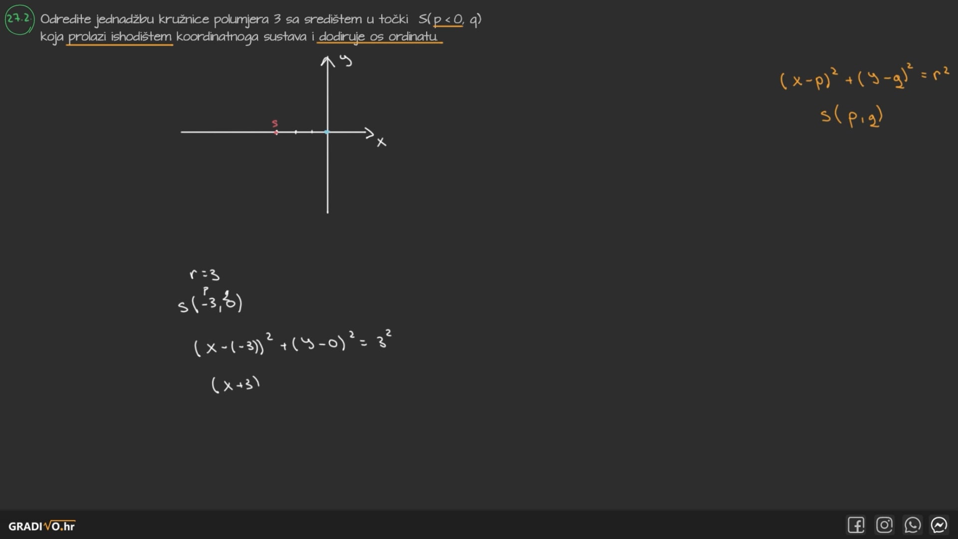 Kružnice koje diraju koordinatne osi. Ako kružnica dira os $x$ tada je $q=r$. Ako kružnica dira os $y$ tada je $p=r$.