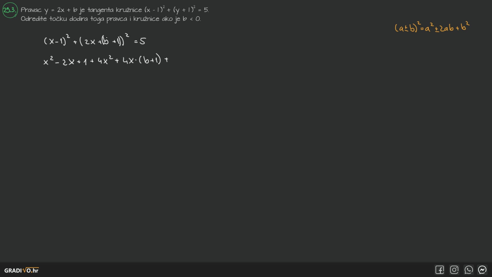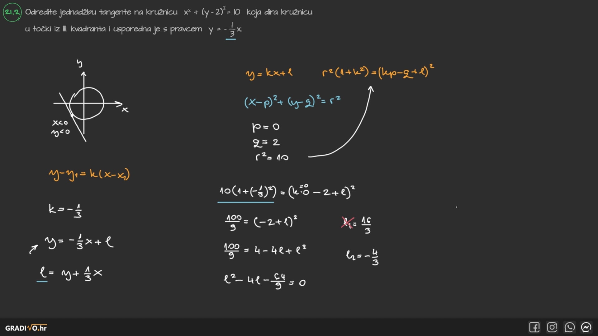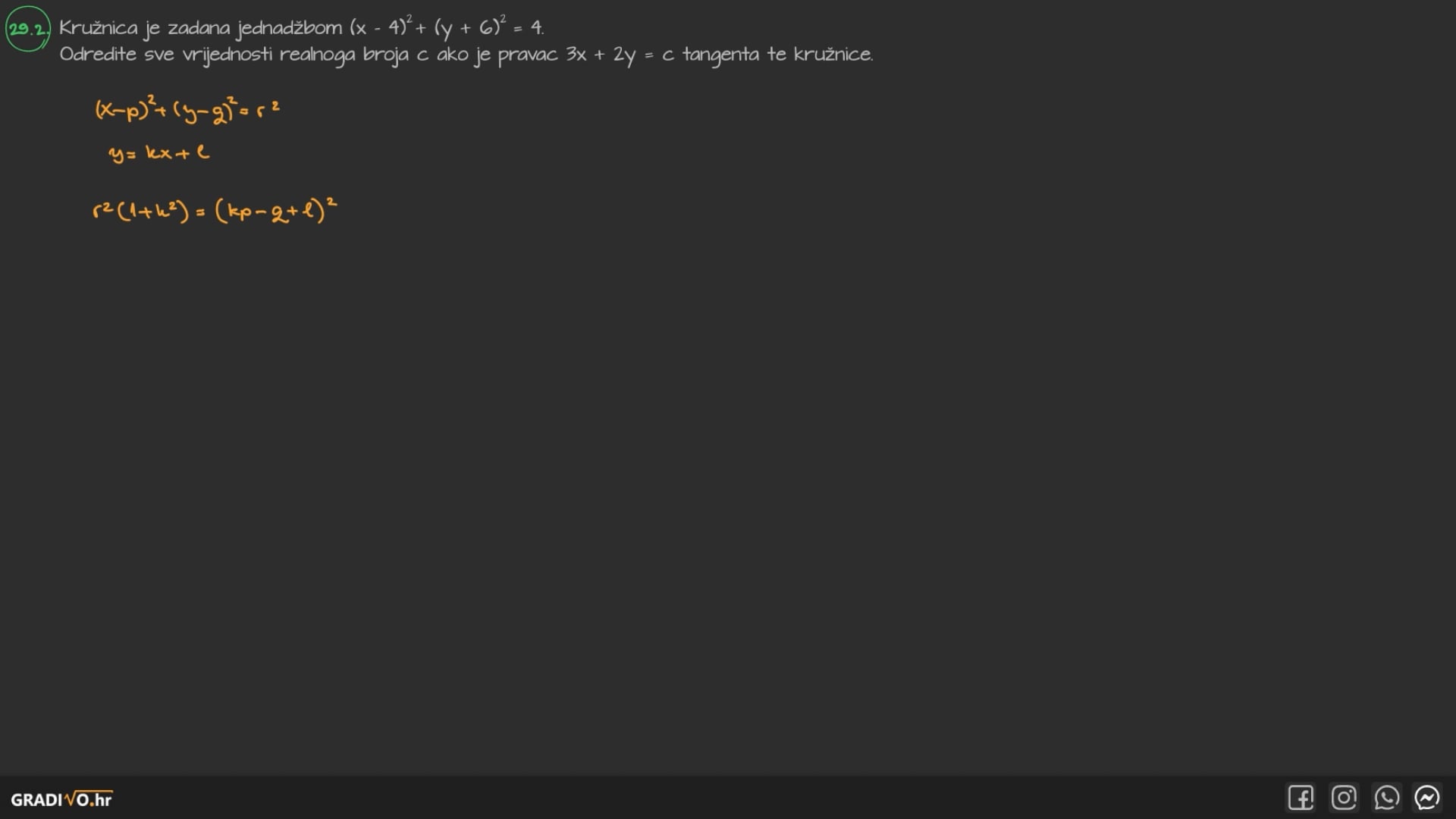 Uvjet dodira pravca i kružnice$ r^{2}\left(1+k^{2}\right)=(q-k p-l)^{2} $