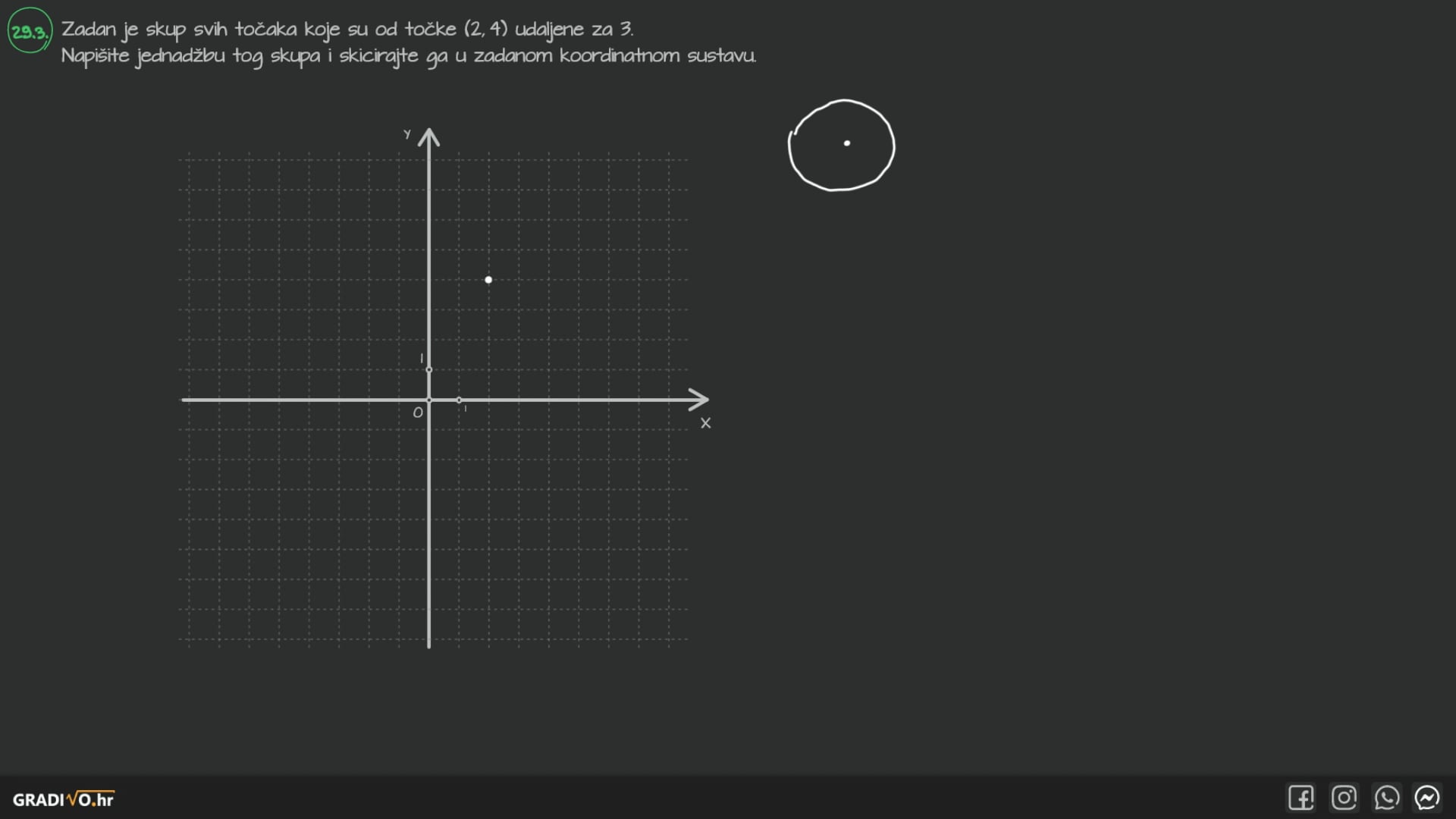 Ako su imamo tri točke u koordinatnom sustavu, postoji točno jedna kružnica koja prolazi kroz sve njih. Do njezine jednadžbe ćemo doći tako da u opću jednadžbu kružnice (prva formula na stranici) ubacimo umjesto $x$ i $y$ koordinate zadanih točaka.