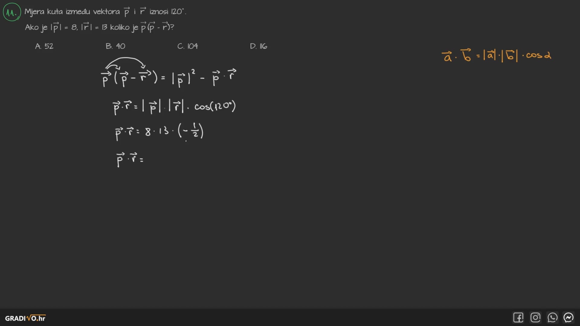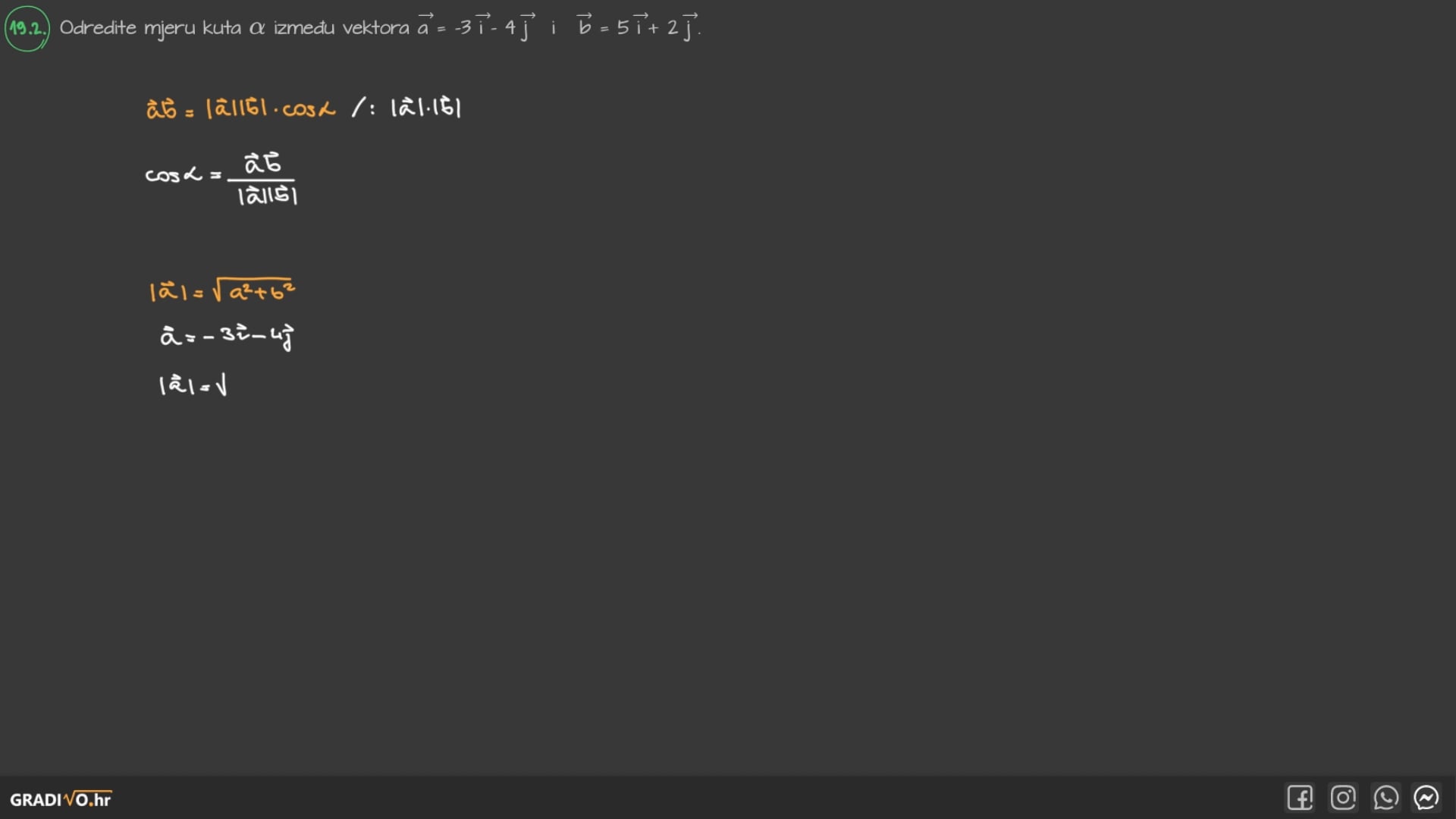 Skalarni umnožak vektora dan je sljedećom formulom, gdje su $\vec{a}$ i $\vec{b}$ neki vektori, a $\varphi$ kut između njih.