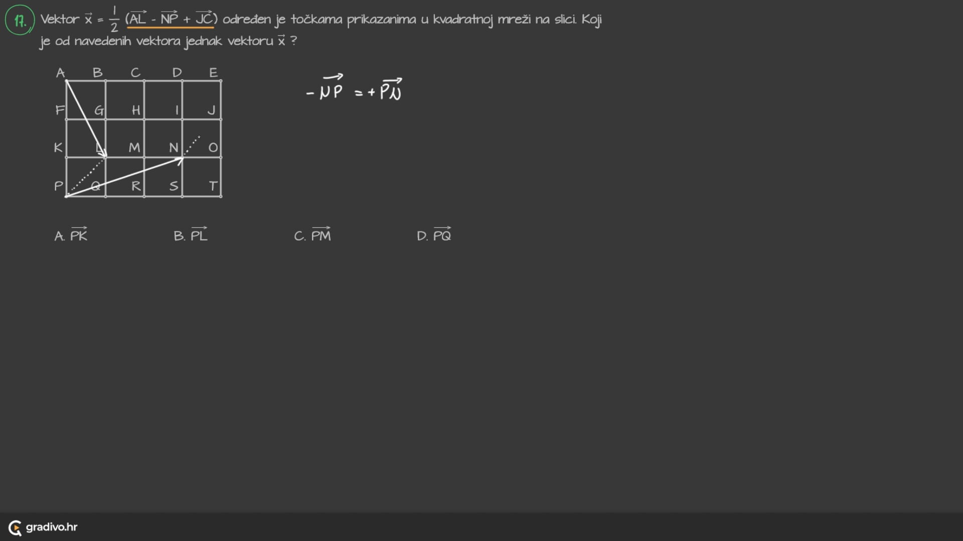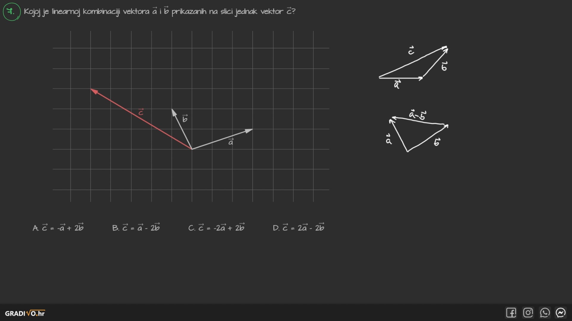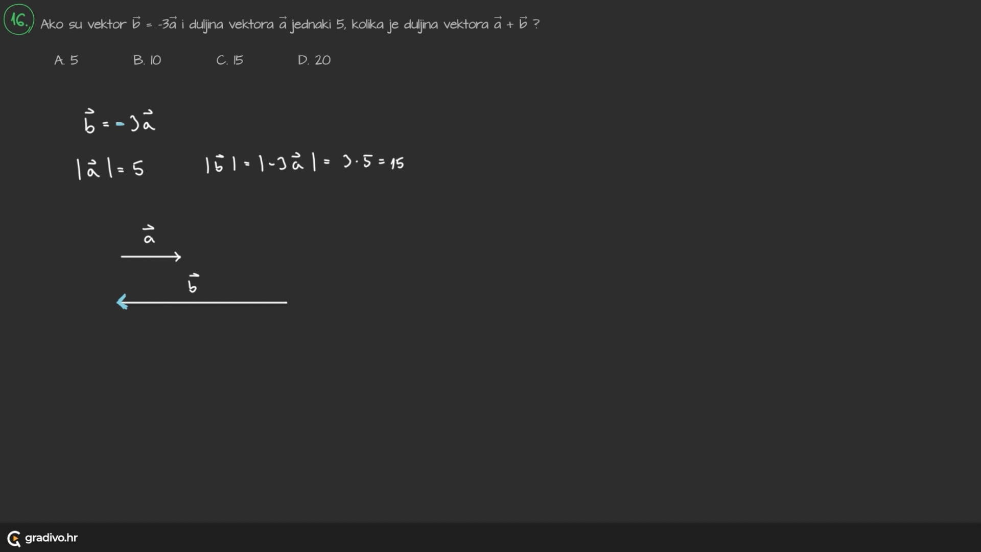 - ako je $k>0$ onda mu je orijentacija jednaka orijentaciji vektora $\vec{a}$, a ako je $k<0$ onda mu je orijentacija suprotna orijentaciji vektora $\vec{a}$