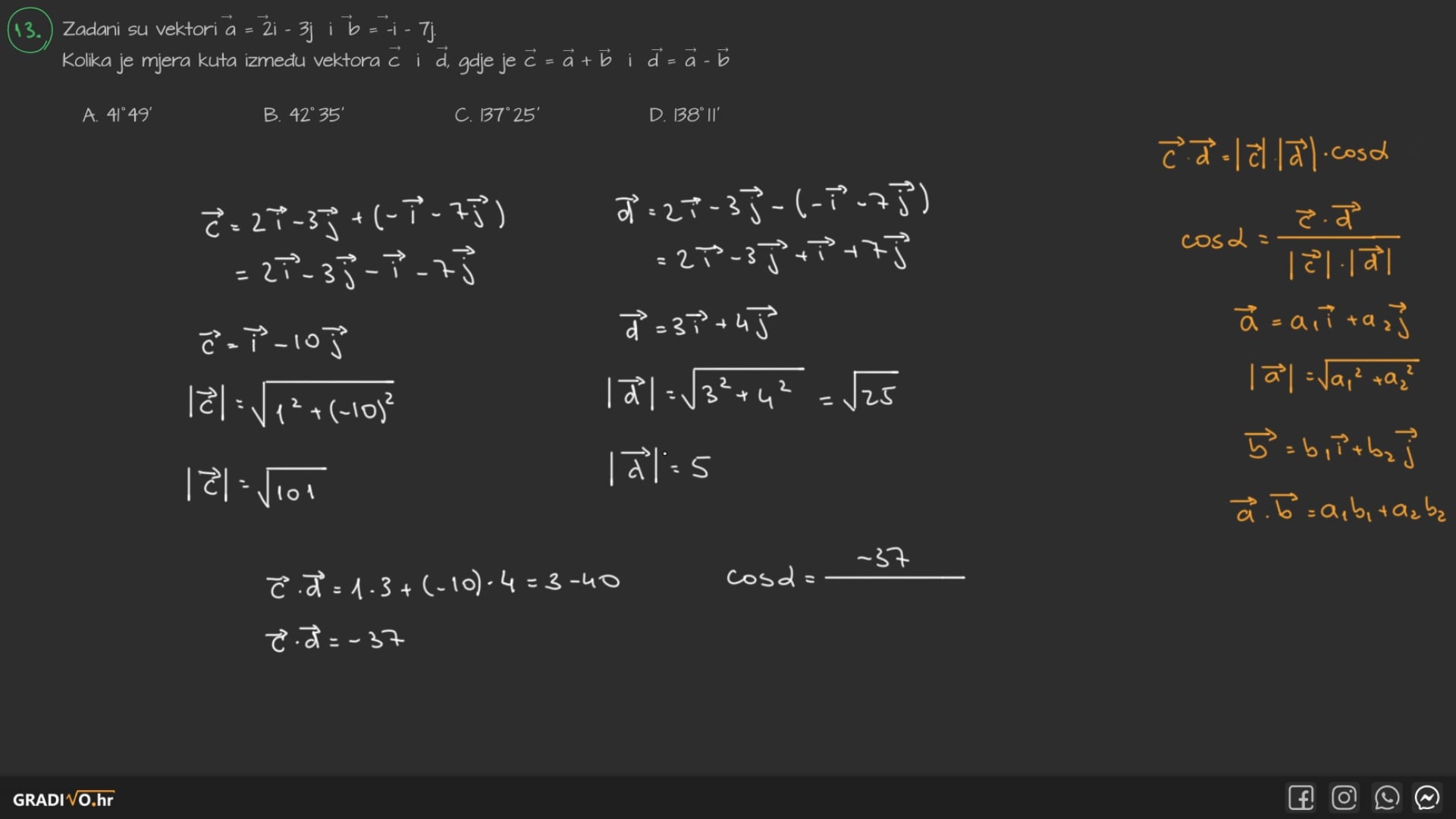 Kut $\varphi$ između vektora $\vec{a} = x_1 \vec{i} + y_1 \vec{j}$ i $\vec{b} = x_2 \vec{i} + y_2 \vec{j}$ u koordinatnom sustavu možemo izračunati pomoću formule: