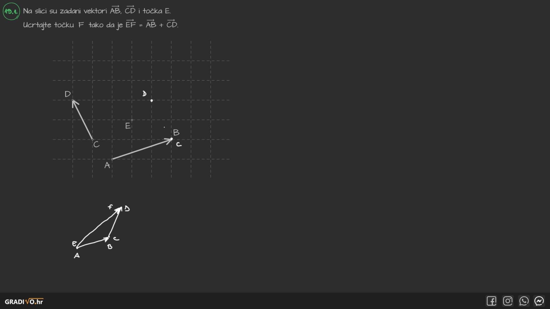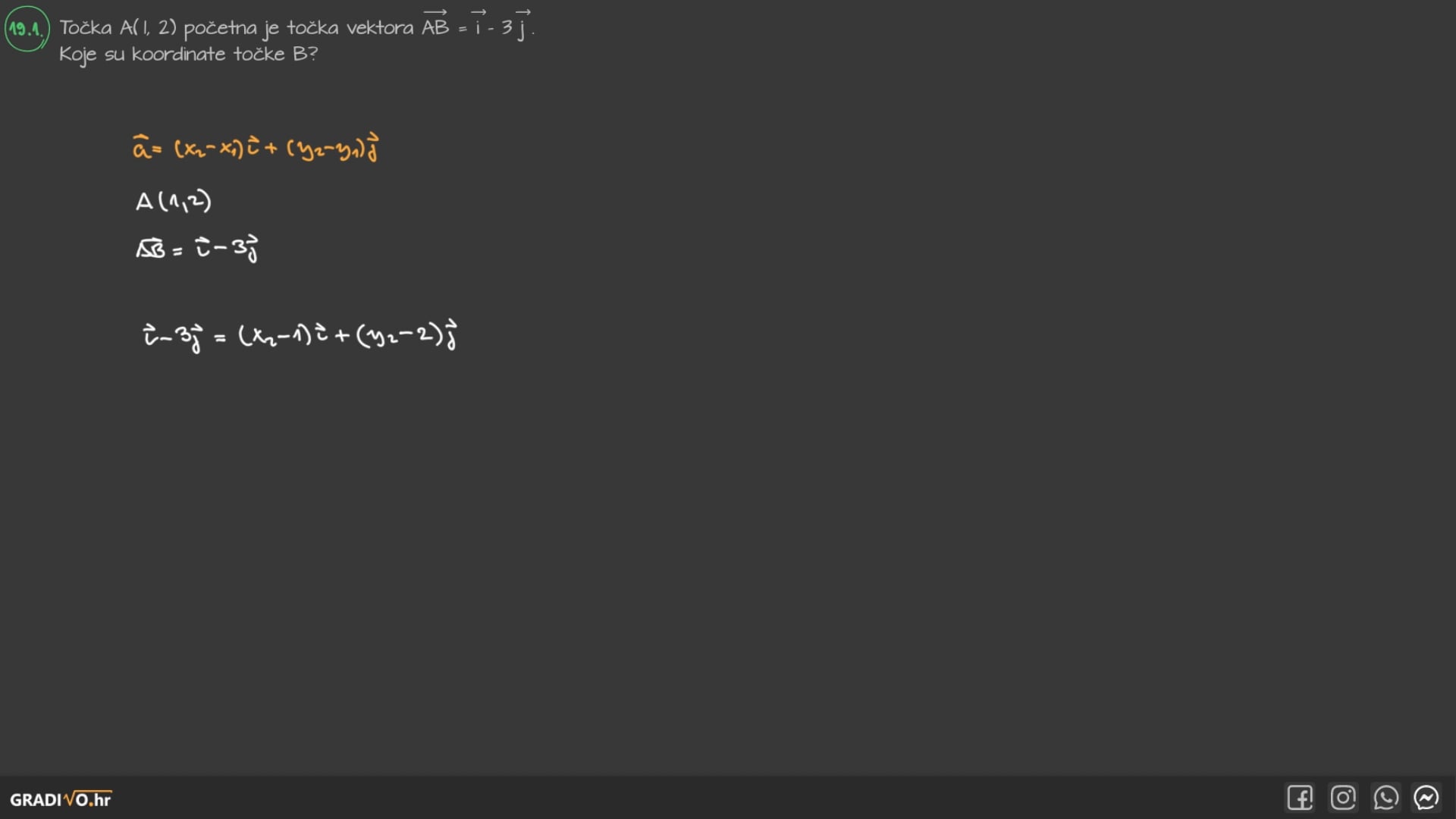 Vektore $\vec{a} = x_1 \vec{i} + y_1 \vec{j}$ i $\vec{b} = x_2 \vec{i} + y_2 \vec{j}$ zbrajamo tako da posebno zbrojimo brojeve uz $\vec{i}$, a posebno brojeve uz $\vec{j}$. Oduzimanje je zbrajanje sa suprotnim vektorom.