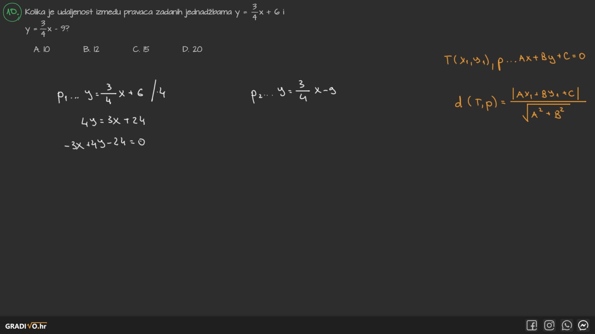 Udaljenost točke $A(x_0,y_0)$ od pravca $Ax+By+C$ računamo: