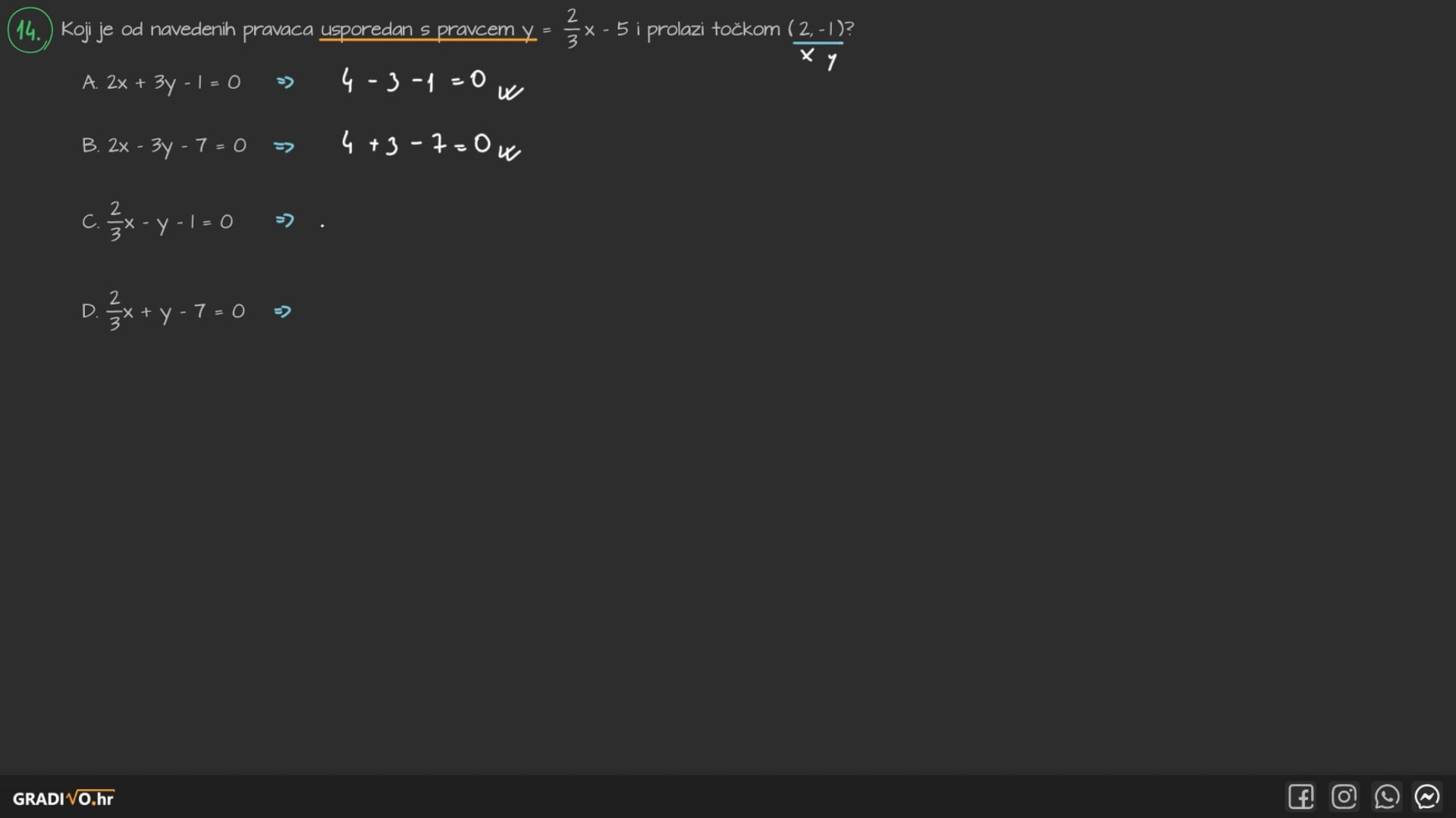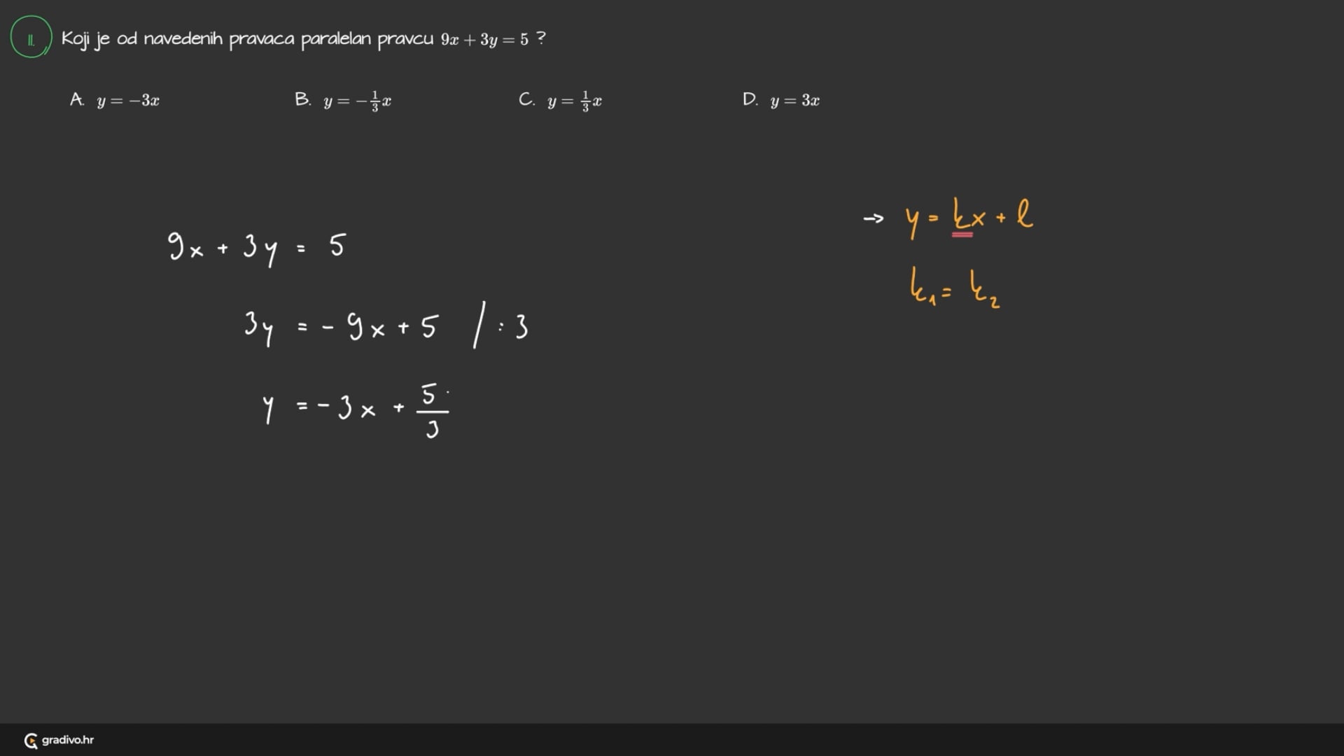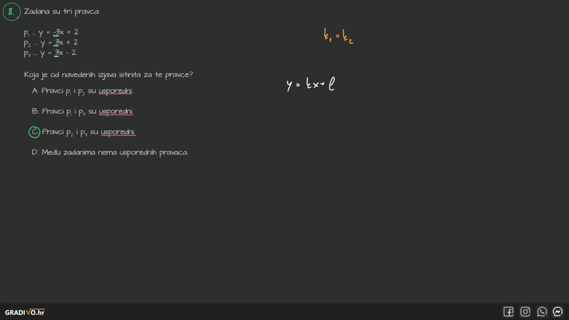 Pravci su paralelni ako vrijedi sljedeće (imamo dvije formule, ovisno zapišemo li pravce u obliku $y=k_1 x + l_2$ i $y=k_2 x + l_2$ ili $A_1x+B_1y+C_1 = 0$ i $A_2x+B_2y+C_2=0$):