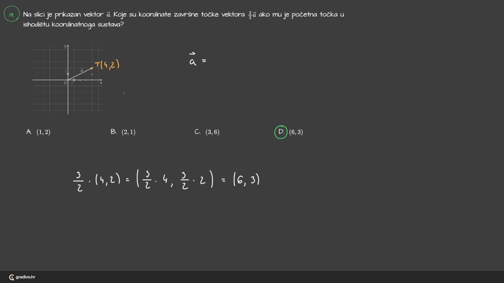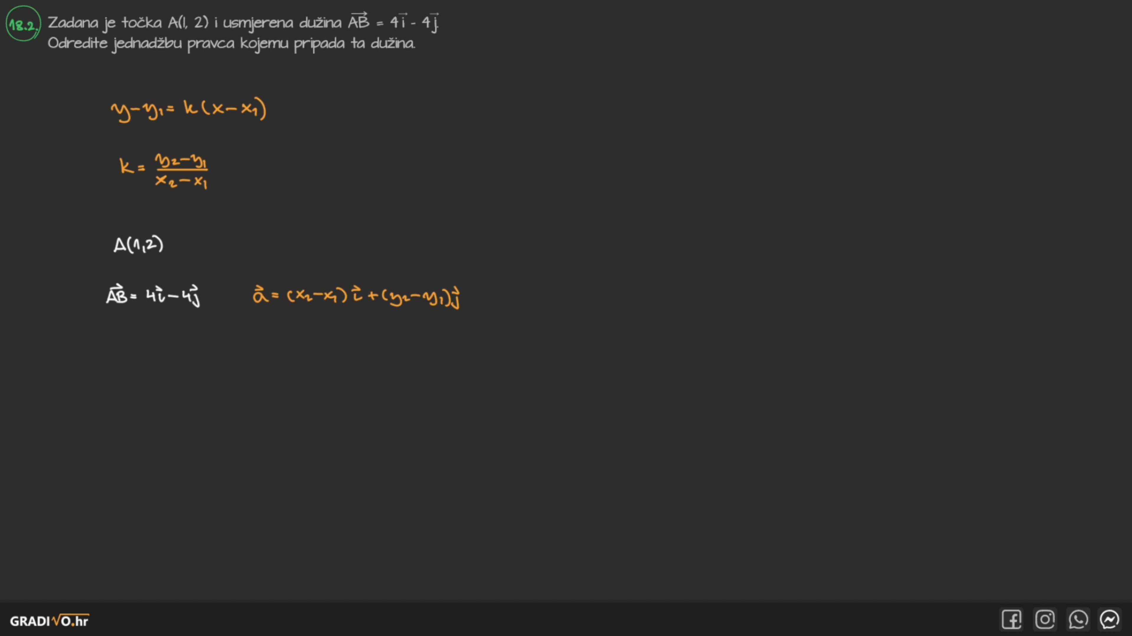 Radijvektor točke $A(x,y)$ prikazujemo u obliku $x \vec{i} + y \vec{j}$. Vektor $\vec{AB}$ s početkom u točki $A(x_1,y_1)$ i krajem u točki $B(x_2,y_2)$ prikazujemo u obliku: