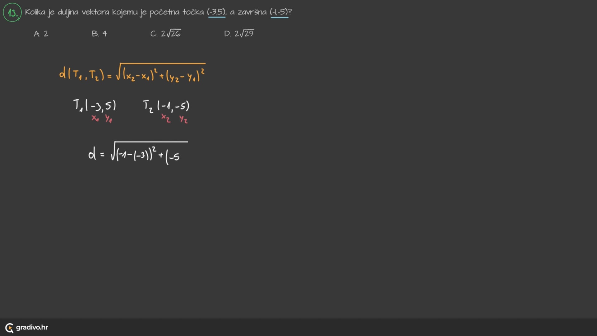 Duljina vektora (modul) $\vec{AB}$, gdje je $A(x_1, y_1)$ i $B(x_2, y_2)$, se računa formulom:
