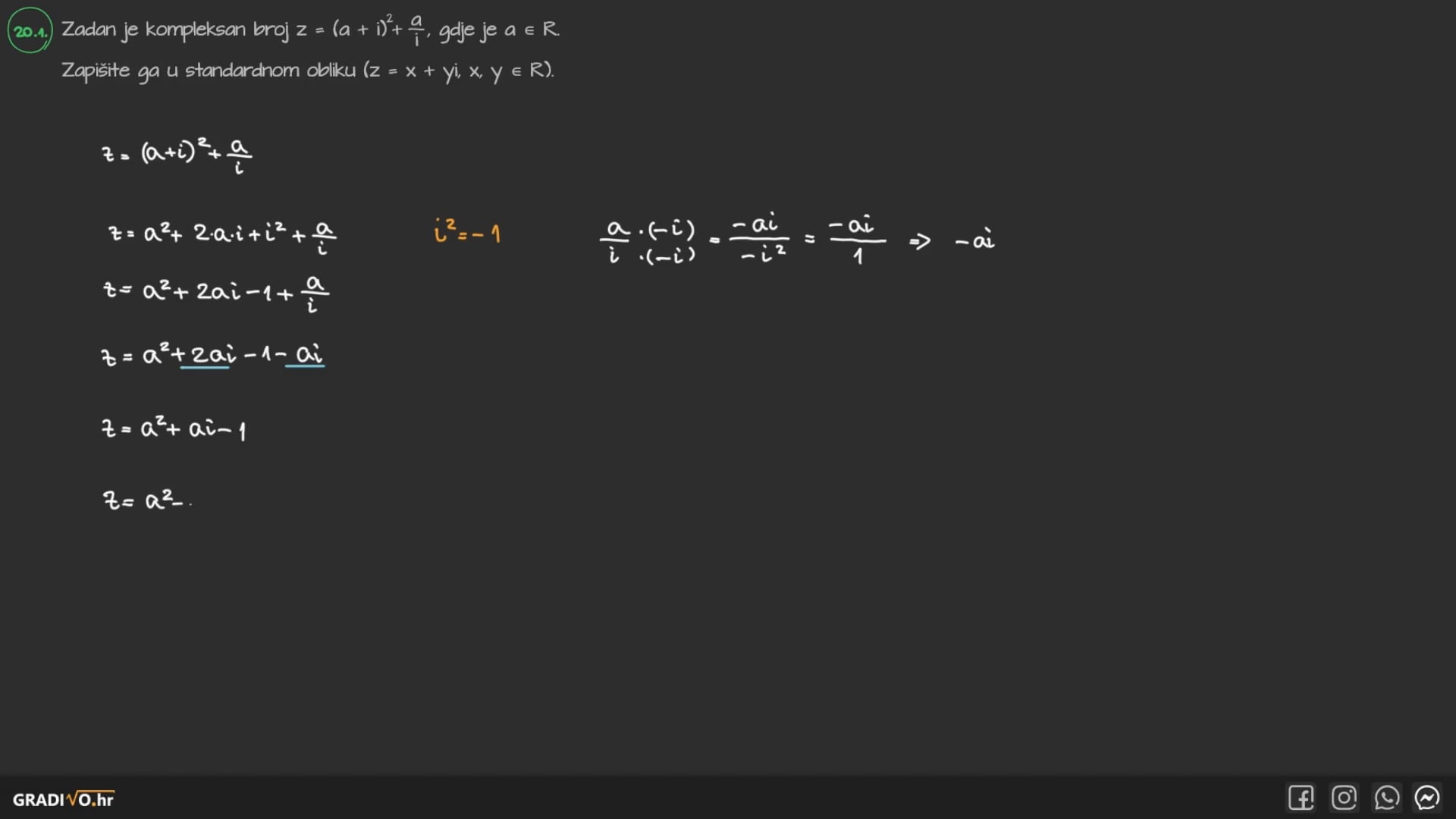 2. Gore napravimo množenje kao što znamo, a dolje isto pomnožimo zagrade ili iskoristimo formulu za množenje kompleksno konjugiranih brojeva (nalazi se malo niže).