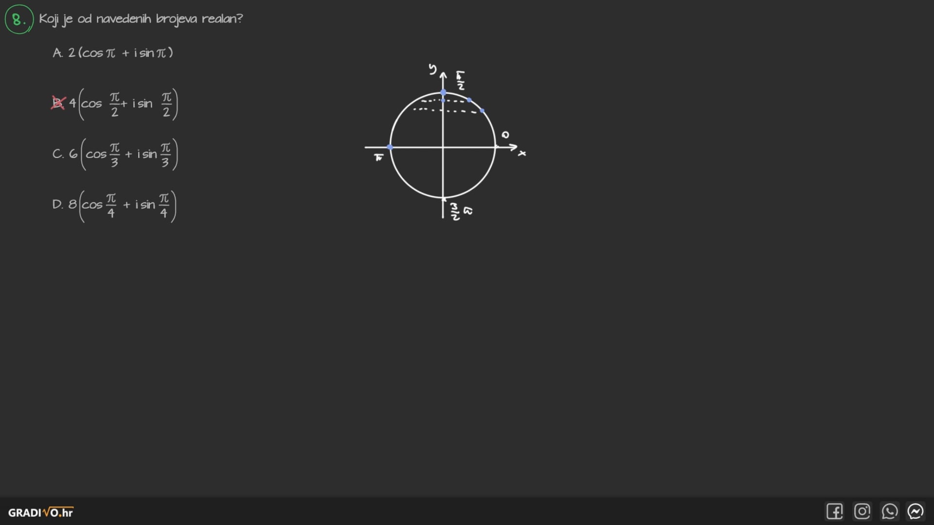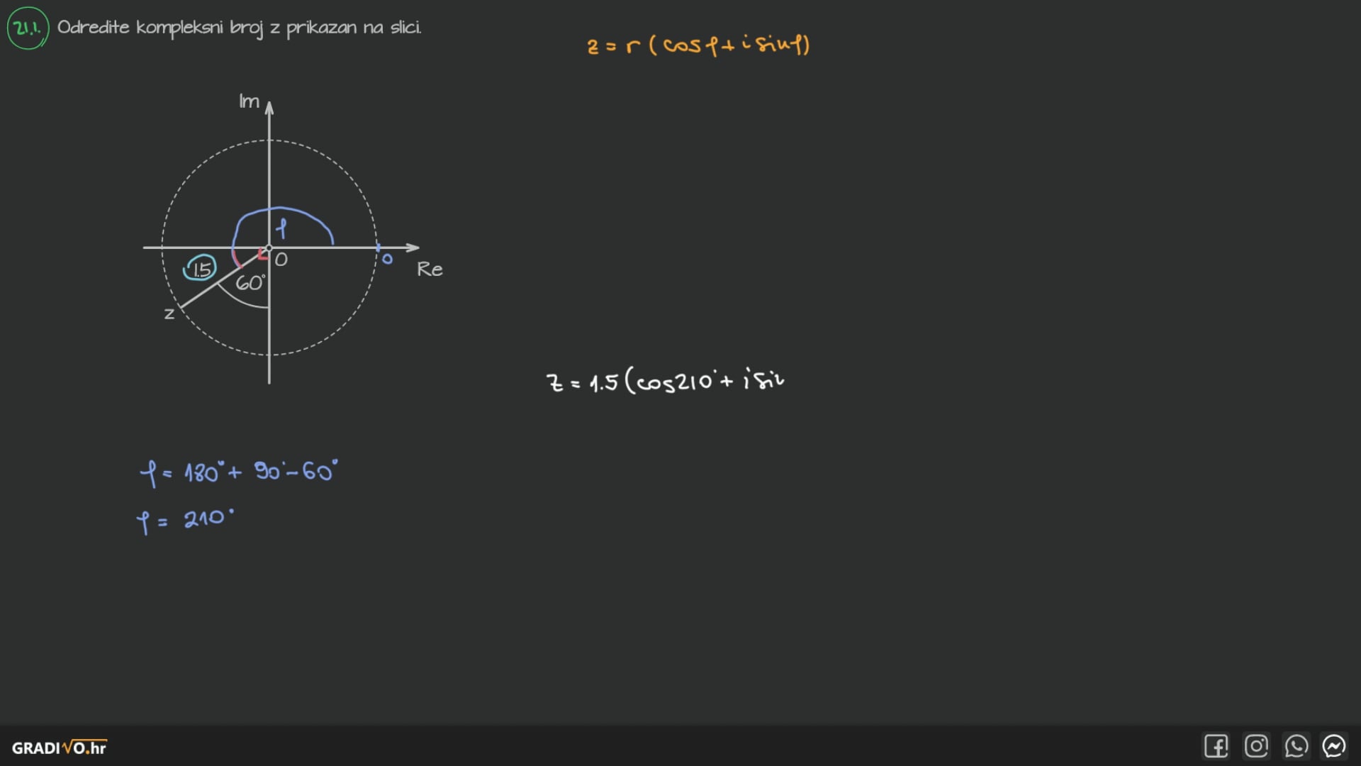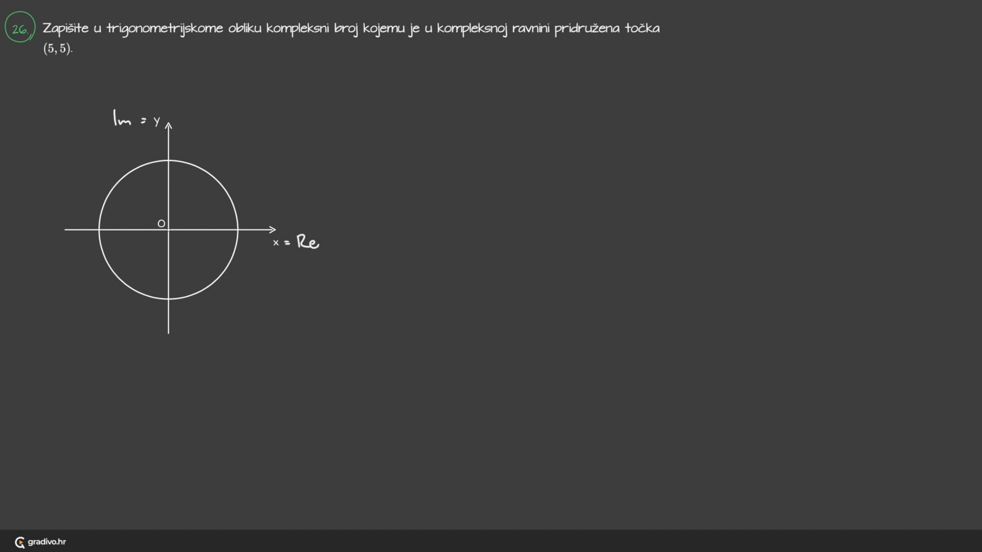 $\varphi$ ćemo dobiti tako što ćemo u kalkulator unijeti $arctg(\frac{y}{x})$. Međutim, iako će nam kalulator izbaciti vrijednost za $\varphi$, nekada će biti potrebno taj kut prilagoditi kvadrantu u kojem se nalazi naš kompleksan broj. Taj kompleksan broj je potrebno prikazati u kompleksnoj ravnini tj. dovoljno je označiti u kojem kvadrantu se on nalazi. Također, sjetimo se da kada rješavamo trigonometrijsku jednadžbu s funkcijom tangensa, da na rješenje koje izbaci kalkulator dodajemo "$+2k\pi, k \in \mathbb{Z}$". Kada znamo te dvije stvari, lako ćemo odrediti koji kut odgovara našem kompleksnom broju. Pogledajmo na primjeru određivanje $\varphi$ kao i samo određivanje trigonometrijskog prikaza kompleksnog broja.